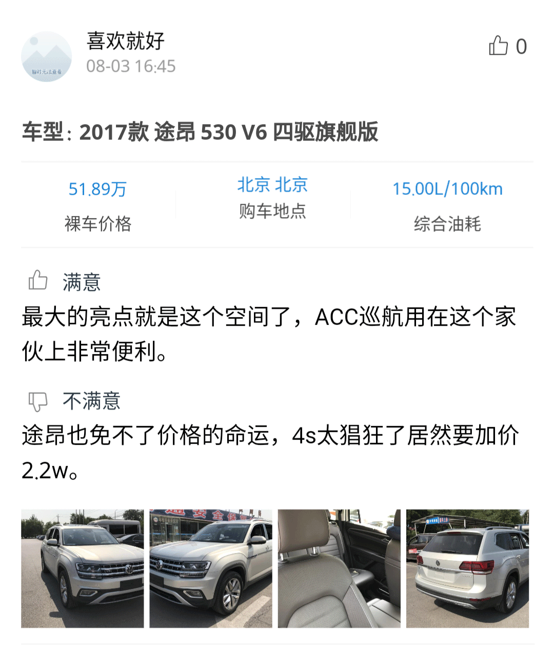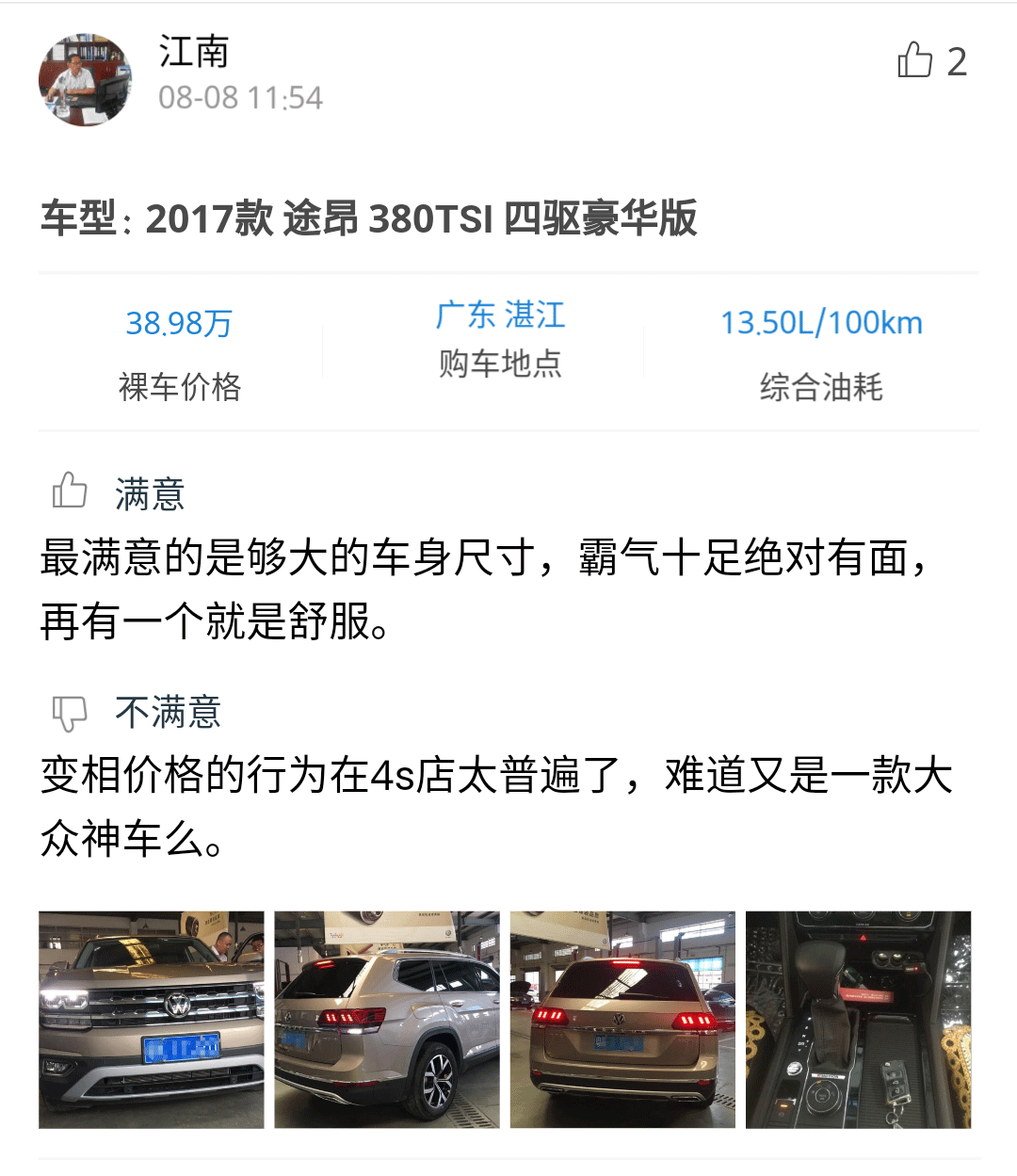 感兴趣的朋友可以点击小程序查看详细口碑,从口碑中可以看到,车主们对途昂的大空间、舒适性还有操控感受都比较满意。但也有车主分享了在买车时被一些4S店以某些形式变相加价的问题。