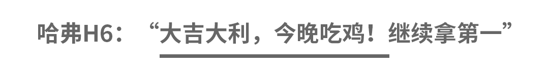 哈弗H6:刚聊完我家小弟,怎么还把我撤出来谈,我拿第一不是超正常的事吗?就连小弟哈弗M6上个月都月销10059辆,破万了。咱们哈弗SUV就是牛!来啦~大吉大利,今晚吃鸡!