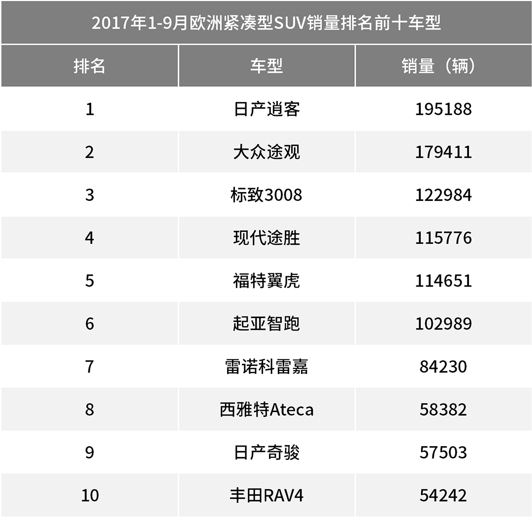今年前9个月,欧洲紧凑型SUV的销量排行榜