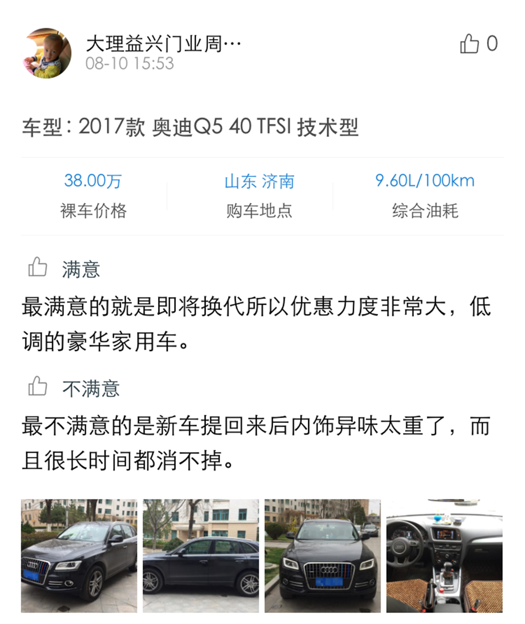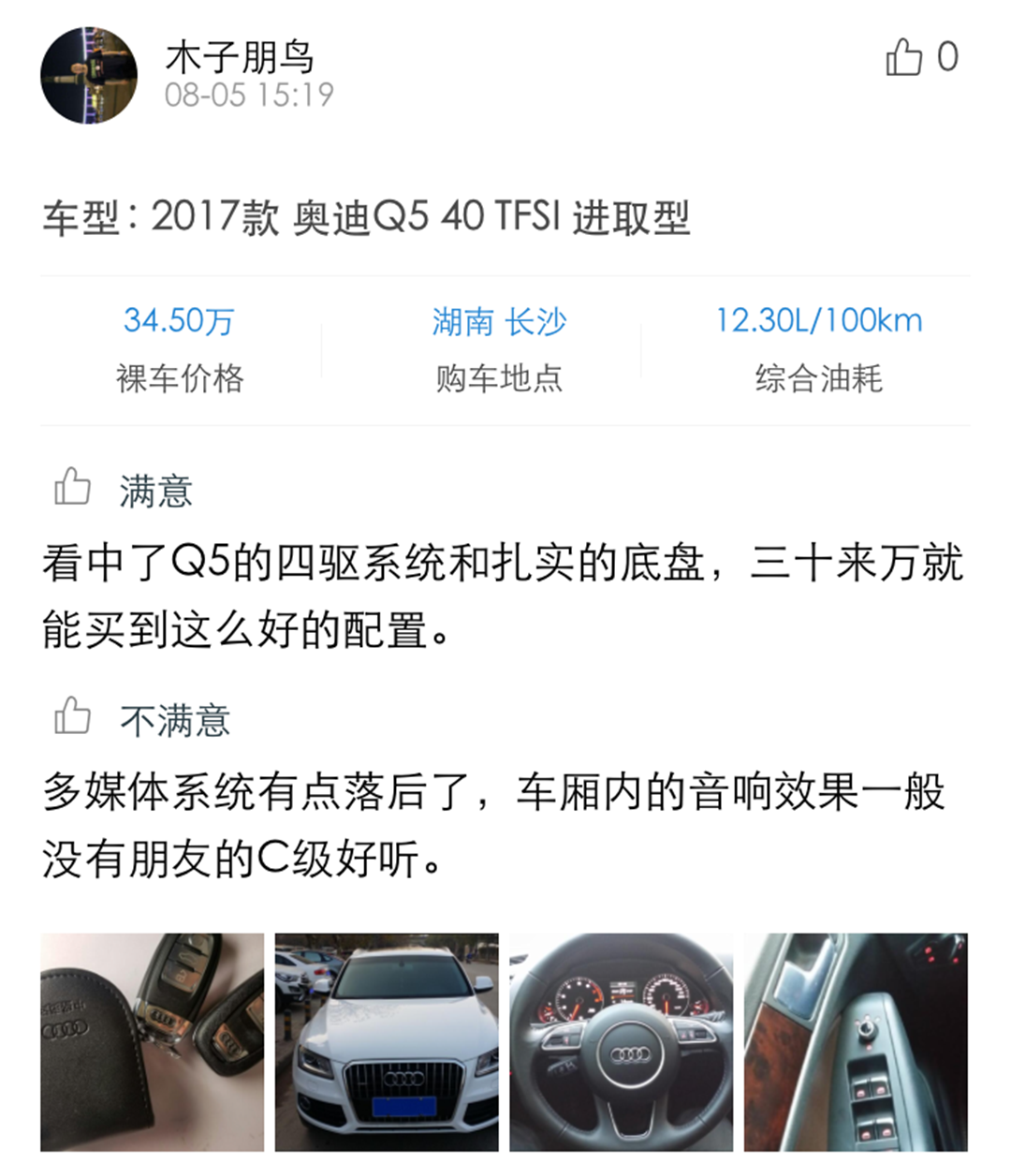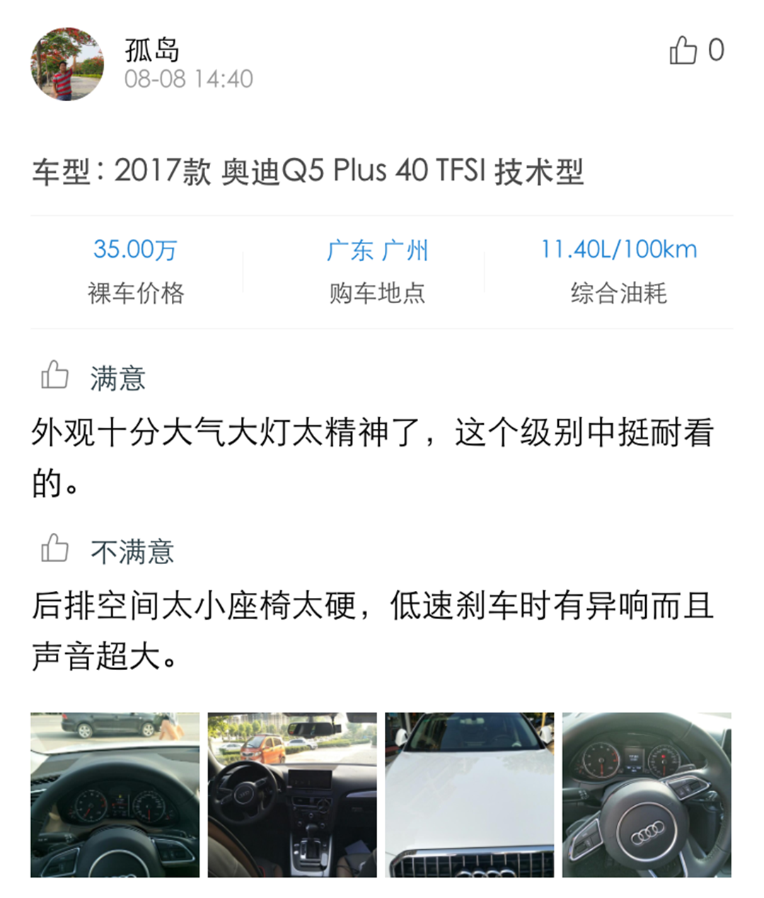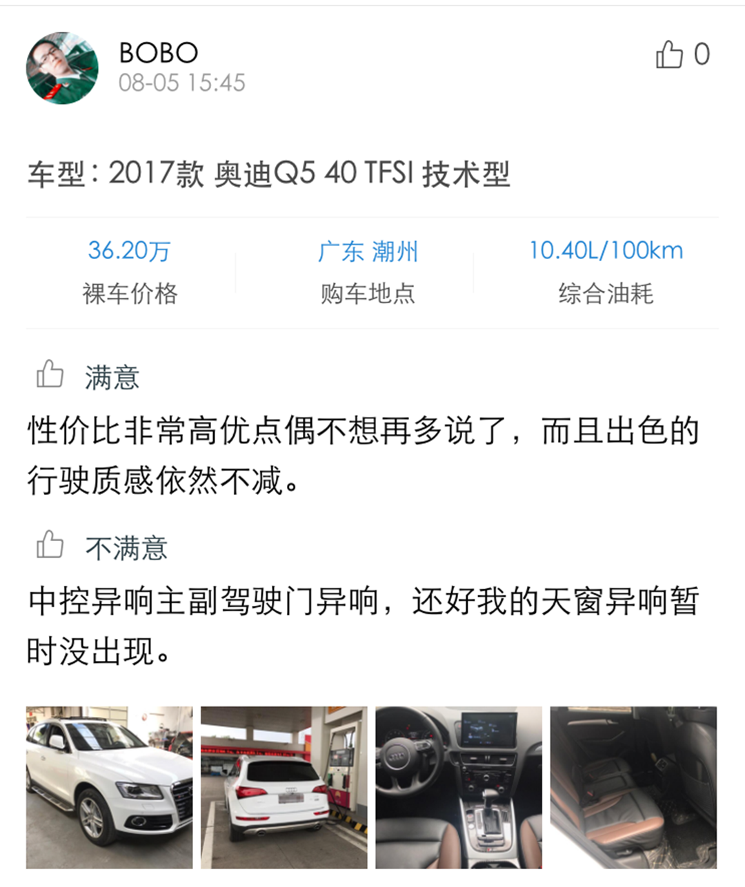 从口碑中可以看到,买了奥迪Q5的车主们对终端优惠、丰富的配置、综合实力均衡等方面都表示满意。而不满意的地方主要是空间偏小、存在异响、内饰较落后等。感兴趣的朋友可以点击小程序查看详细口碑噢。