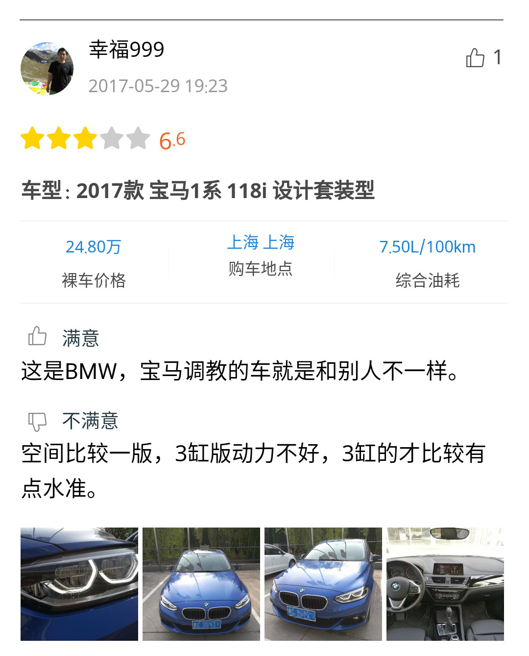 其实外观、内饰都没有太大问题,消费者们最大争议的还是三缸发动机和前置前驱的布局,有人认为这并非是一辆宝马,也有人认为必须舍弃这些高成本的机制,才能让预算有限的宝马粉们圆满一个蓝天白云梦。不过除了发动机和驱动布局,1系的变速箱和底盘表现还是让车主们比较满意的。