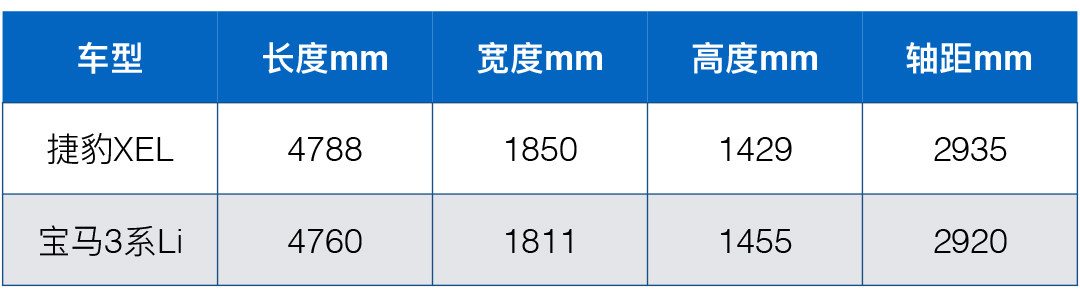 在车身尺寸方向上,捷豹XEL在轴距加长100mm之后,无论是车身长度还是车身宽度,它都要比对标的宝马3系要稍微大点。