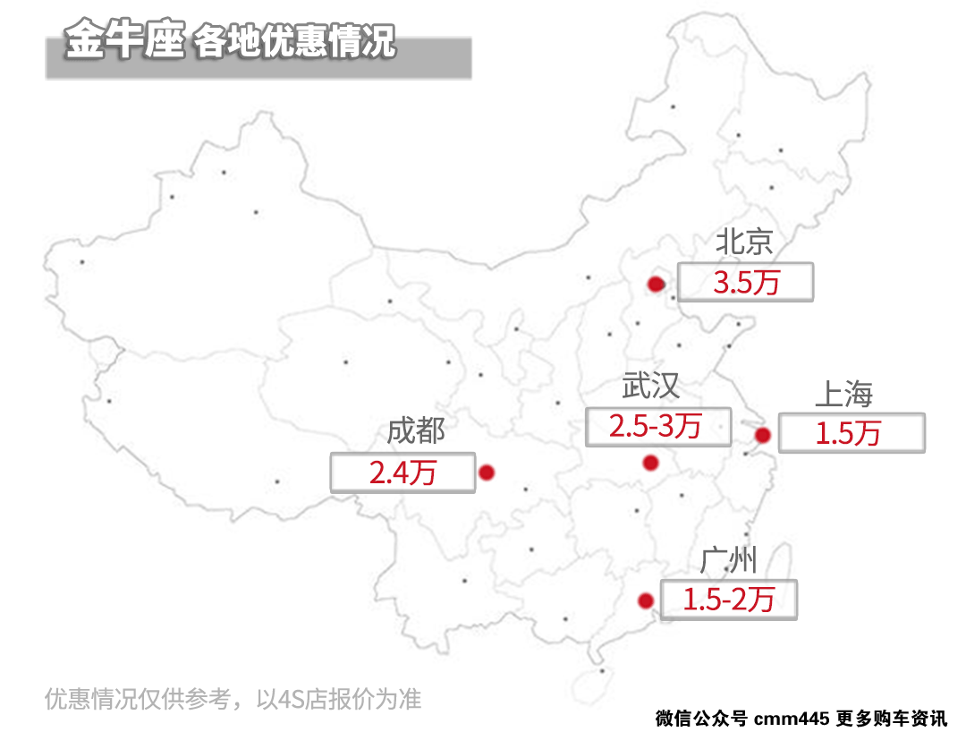 咱们发现金牛座的优惠幅度还是挺可观的,大部分地方以现金优惠为主,而在优惠幅度最大的北京、武汉等地则需要搭配店内贷款、上保险、置换、购买精品等项目。