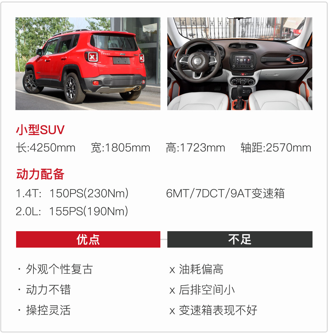 个性的造型是自由侠最大的魅力,外观上保留了Jeep家族众多的经典设计,比如7格进气格栅、圆形的头灯、方方正正的车身,自由侠上市以来就圈粉无数,国人对Jeep的情怀是一方面,但更多的还是因为它个性复古的设计,整体呈现的视觉效果有别市面上的多数车型,可以满足年轻人对个性化的追求。自由侠的内饰设计同样个性,整体质感不错,不过自由侠的车身尺寸比较小,后排空间表现比较一般。