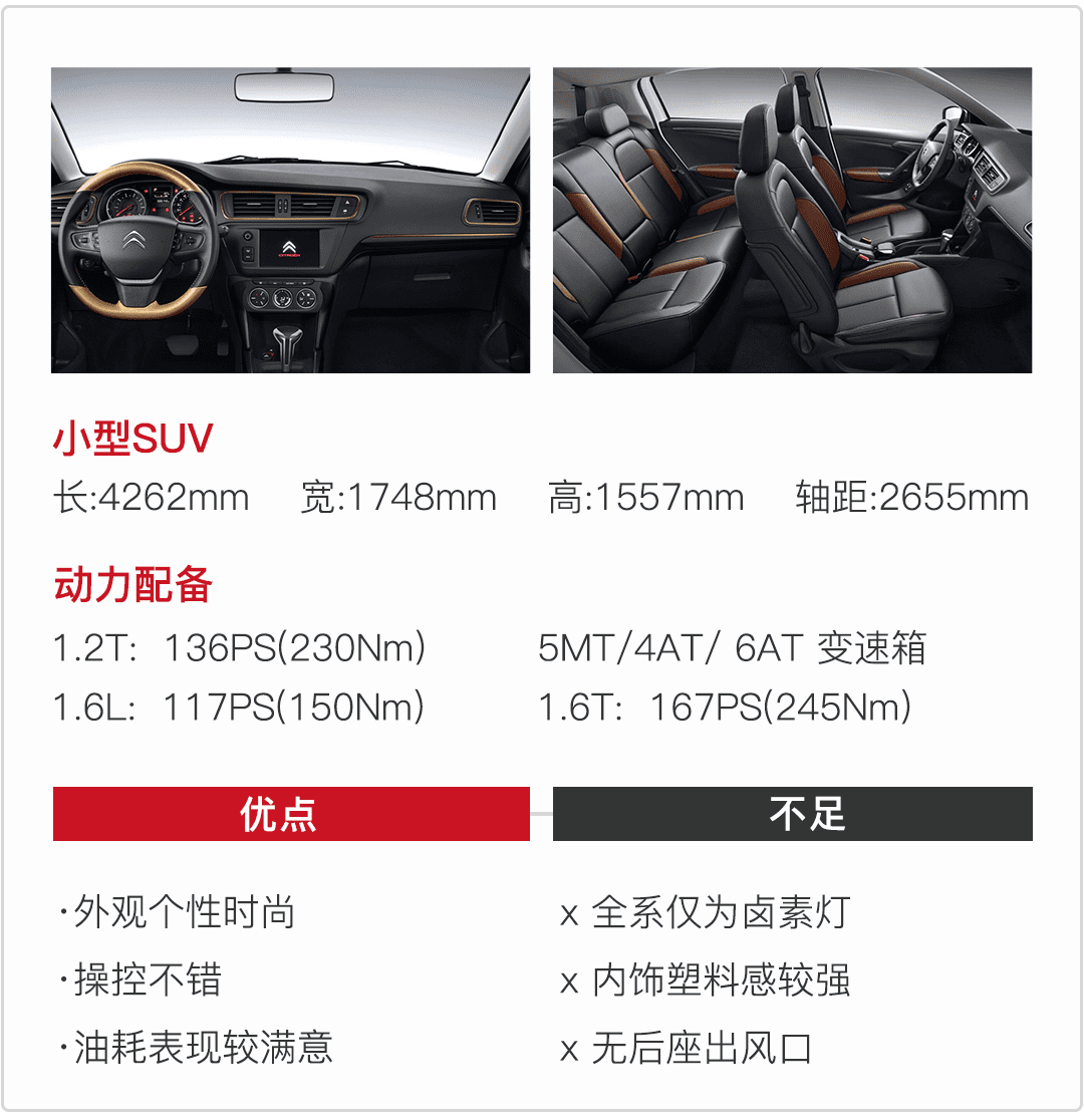 动力方面,C3-XR有1.6L、1.2T和1.6T三款发动机,比较推荐的还是性价比更高的1.2T车型,最大功率136Ps,低扭很足,涡轮介入很早,起步和低速行驶也不会有乏力的迹象,匹配新一代的爱信6AT变速箱,比旧款车型更高效,操控也更加平顺,而最令人满意的是C3-XR的底盘质感非常好,在大家都使用扭力梁的小型SUV里,PSA底盘调校的优势就很明显了。