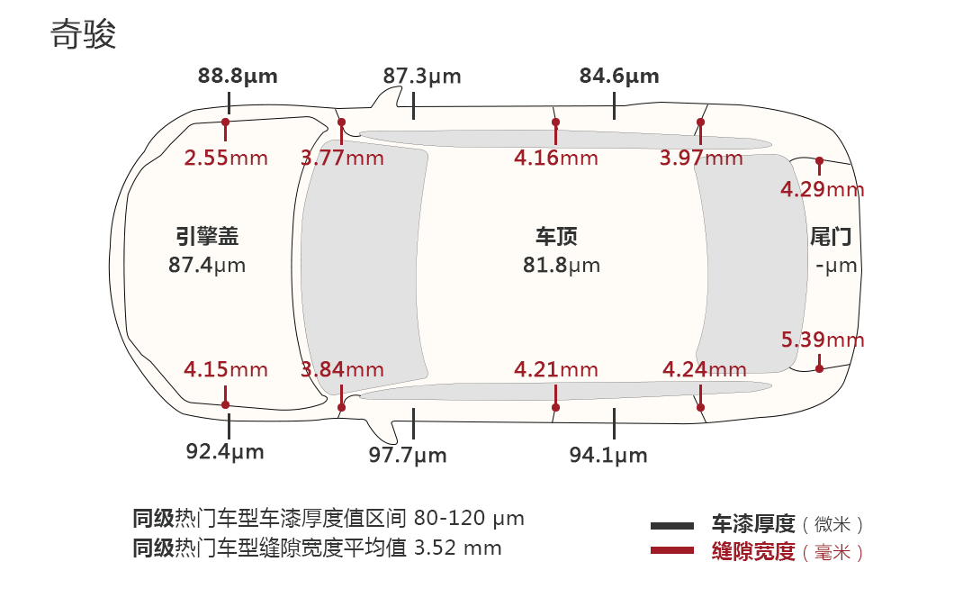 从外观上看,奇骏的全车缝隙还是比较均匀,不过在车漆上奇骏的厚度偏薄,好在车漆的均匀度还是不错,可以说保持了日产一贯的优秀喷漆水准,然而较薄的车漆还是让人略有失望。