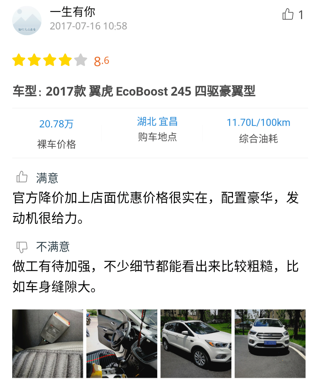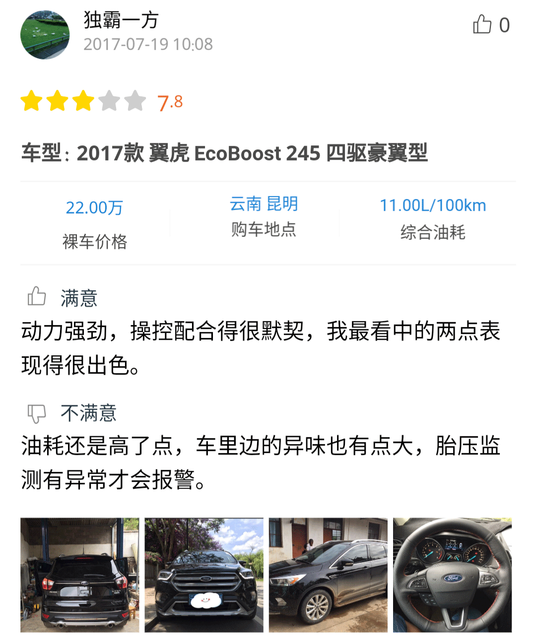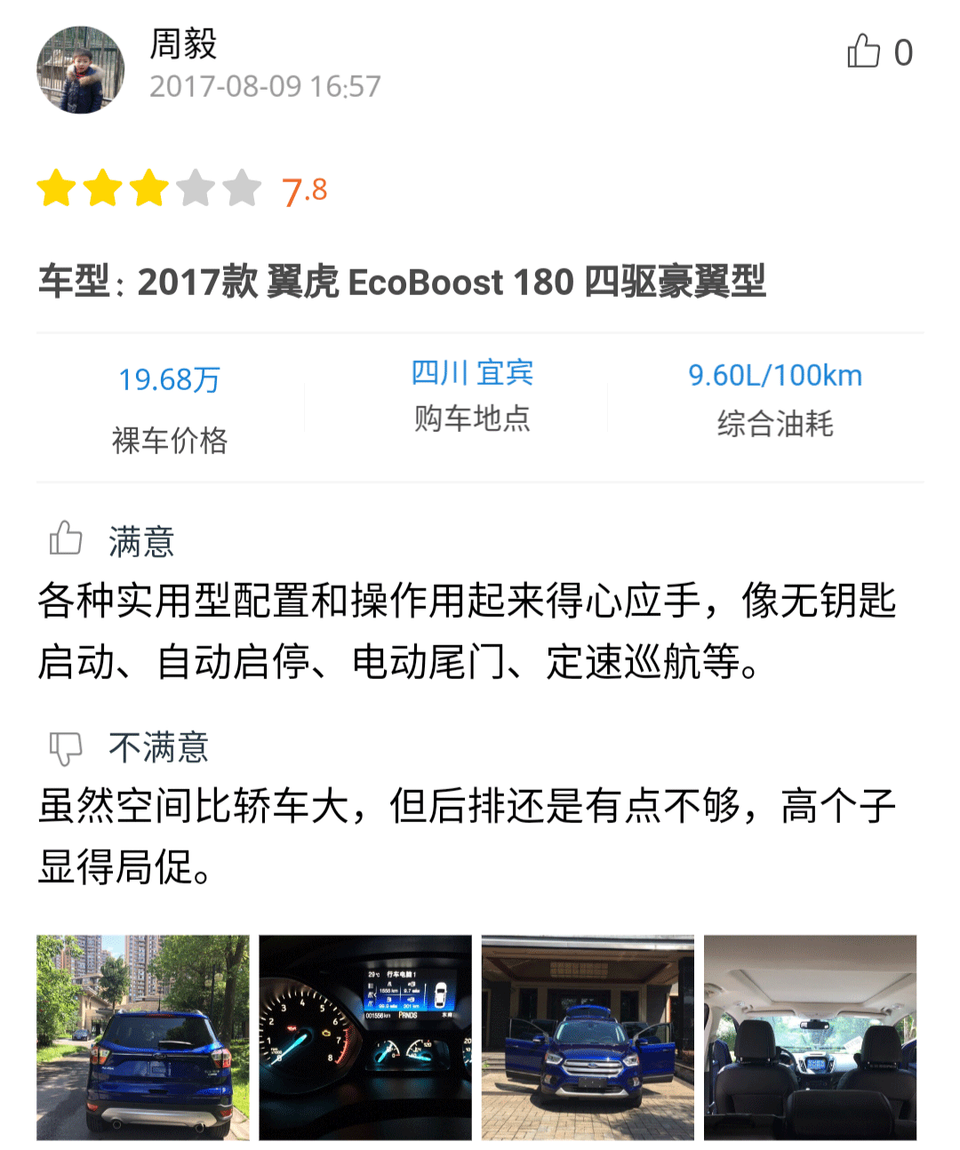 感兴趣的朋友可以点击小程序查看详细口碑,从口碑中可以看到车主们对翼虎的乘坐空间、操控性、2.0T发动机的强劲动力颇为满意,但是对较高的油耗有些不满。