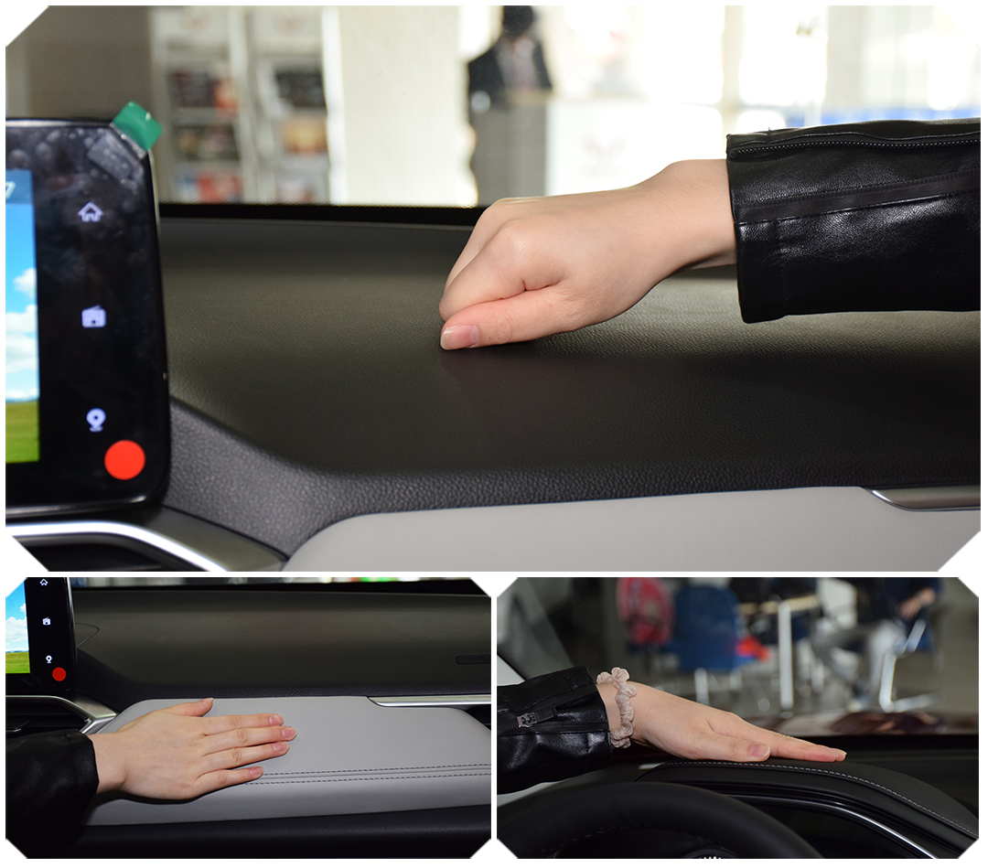 再伸手摸摸,额,怎么中控台上方大面积都是硬质塑料?不过好在中控台下方以及仪表盘上方区域采用了皮革进行包裹。