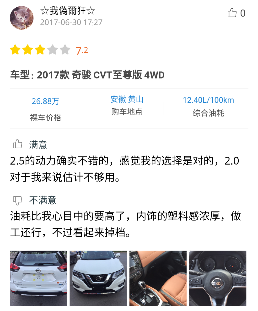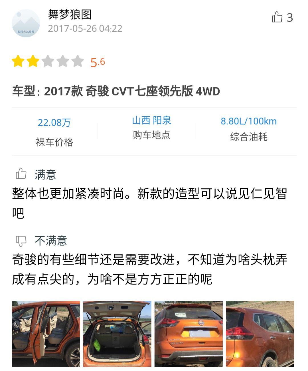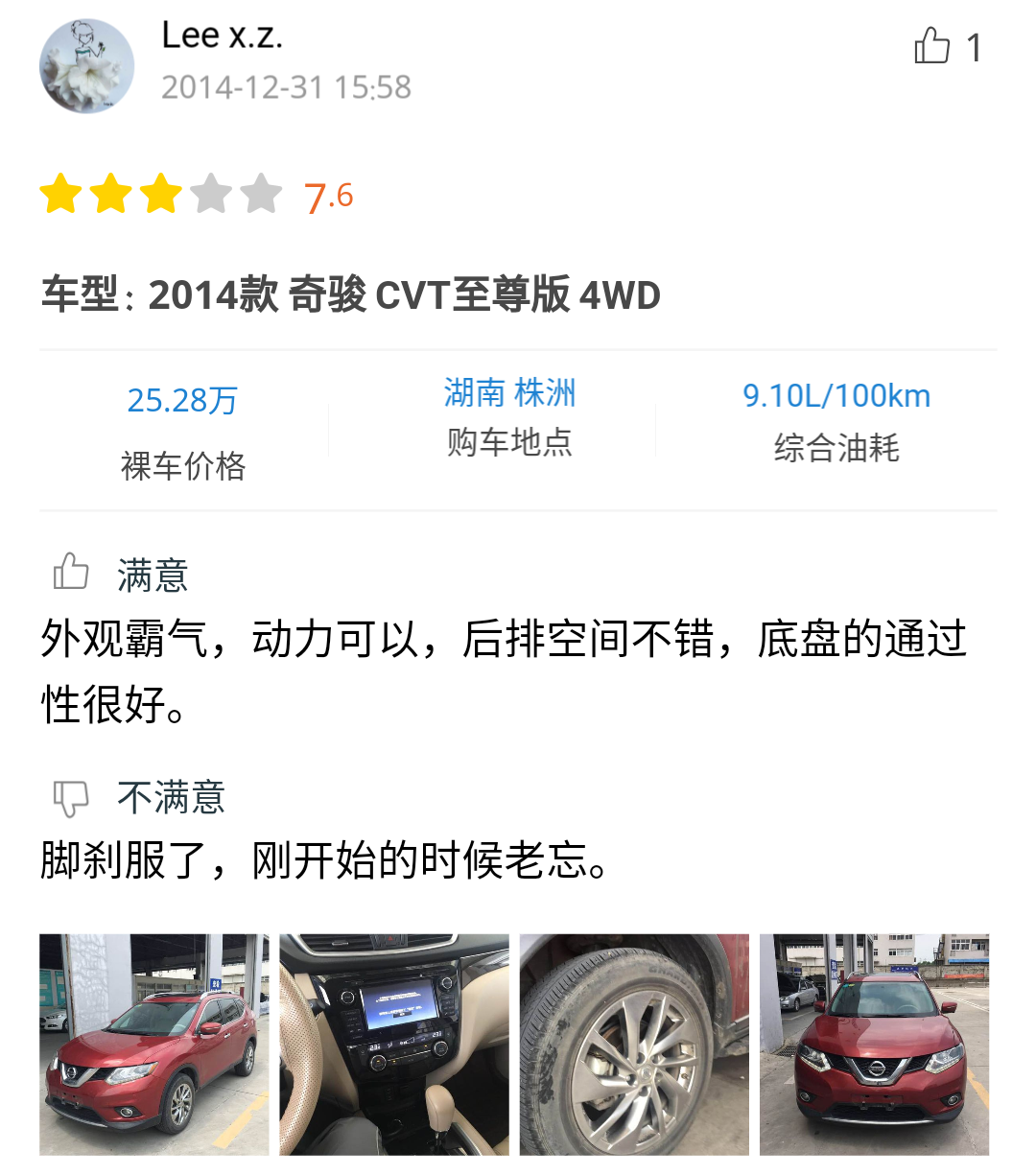 感兴趣的朋友可以点击小程序查看详细口碑,从口碑中可以看到车主们对奇骏的硬朗外形、通过性较好、后排乘坐空间大等优点颇为满意,但是对脚刹驻车和内饰用料方面有些意见。