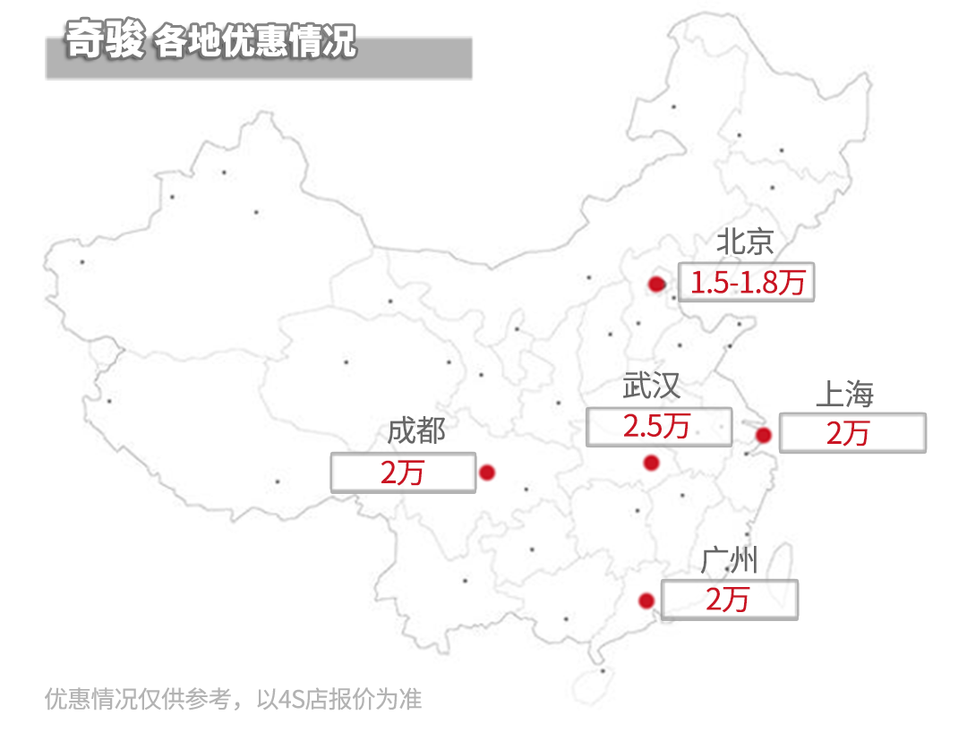 咱们发现奇骏幅度还是比较可观的,在广州需搭配店内上保险、贷款、上牌、置换等项目,而在北京、武汉、上海、成都等地则为现金优惠,性价比不低!