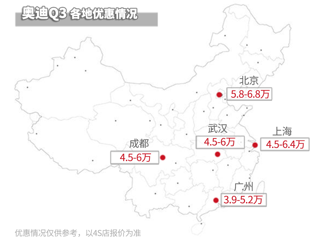 咱们发现奥迪Q3的市场优惠幅度还是很不错的,在广州、武汉等地区需要搭配店内上保险、店内贷款等项目,在北京、上海、成都还需要搭配加装饰、店内上保险、店内上牌等项目。