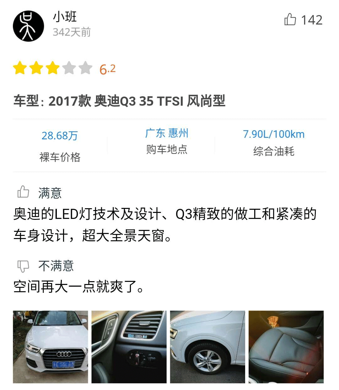 感兴趣的朋友可以点击小程序查看详细口碑,从口碑中可以看到车主们对它的动力、油耗表现颇为满意,对于配置方面也有挺高的评价。而对于后排空间头部空间则有一些投诉。