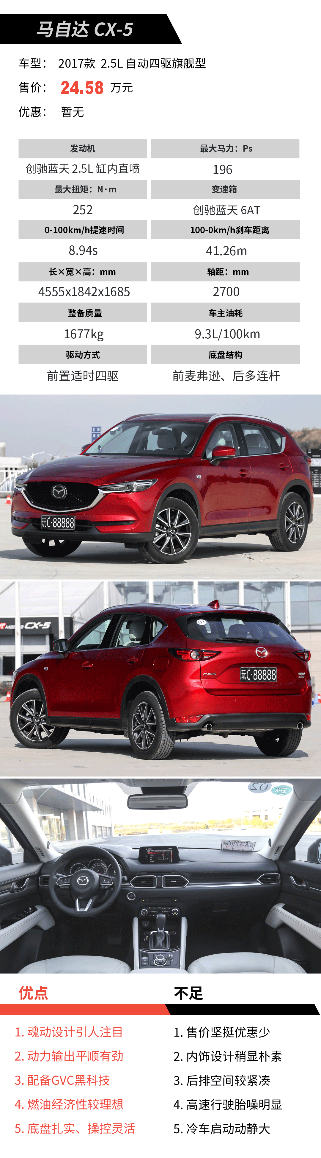 点评:灵感源自奔跑猎豹的“魂动设计”配上一抹艳丽的骚红,浓烈的运动之息油然而生。紧致有韧劲的底盘、契合度极高的创驰蓝天2.5L+6AT动力组合辅以GVC加速度矢量控制系统带来了得心应手的操控感,同级难有对手出其左右。