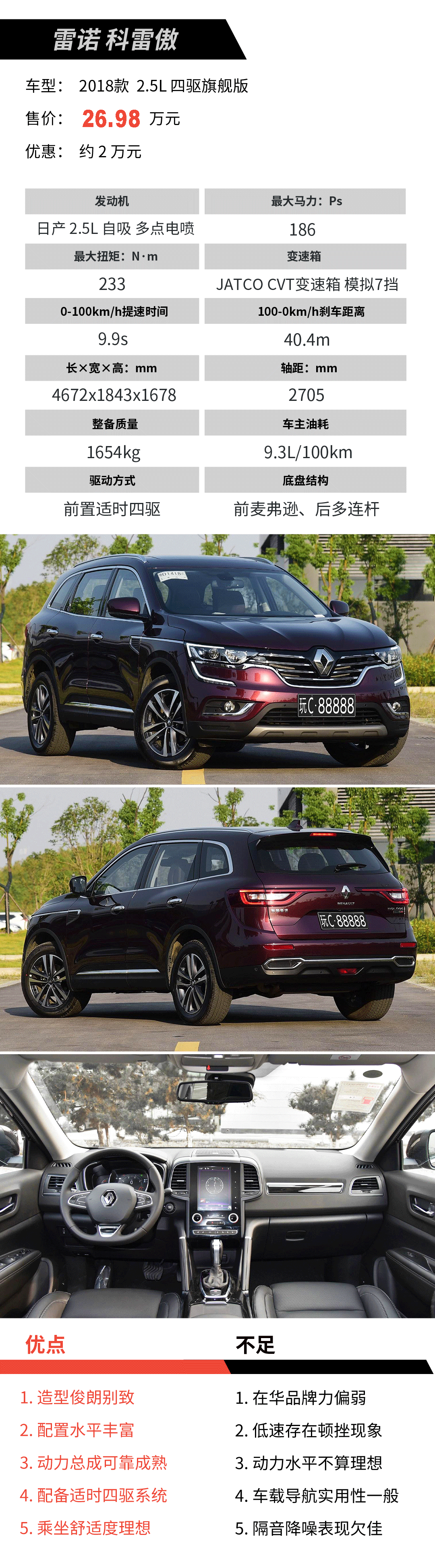 点评:家族式镰刀大灯豪迈而大气,“刷子”尾灯也相当个性。由韩国雷诺三星主导开发、与日产奇骏产自相同的CMF平台的科雷傲,除了法式血统不够纯正,动力表现也平淡得很,但早年的进口身份令其品牌形象比同级对手更有优势。
