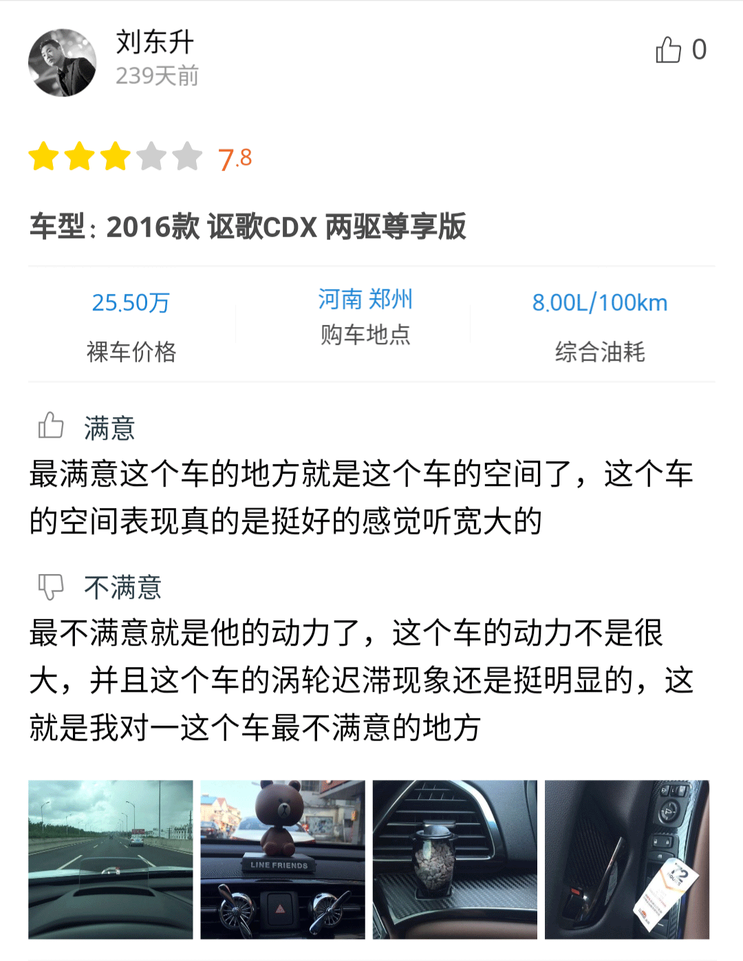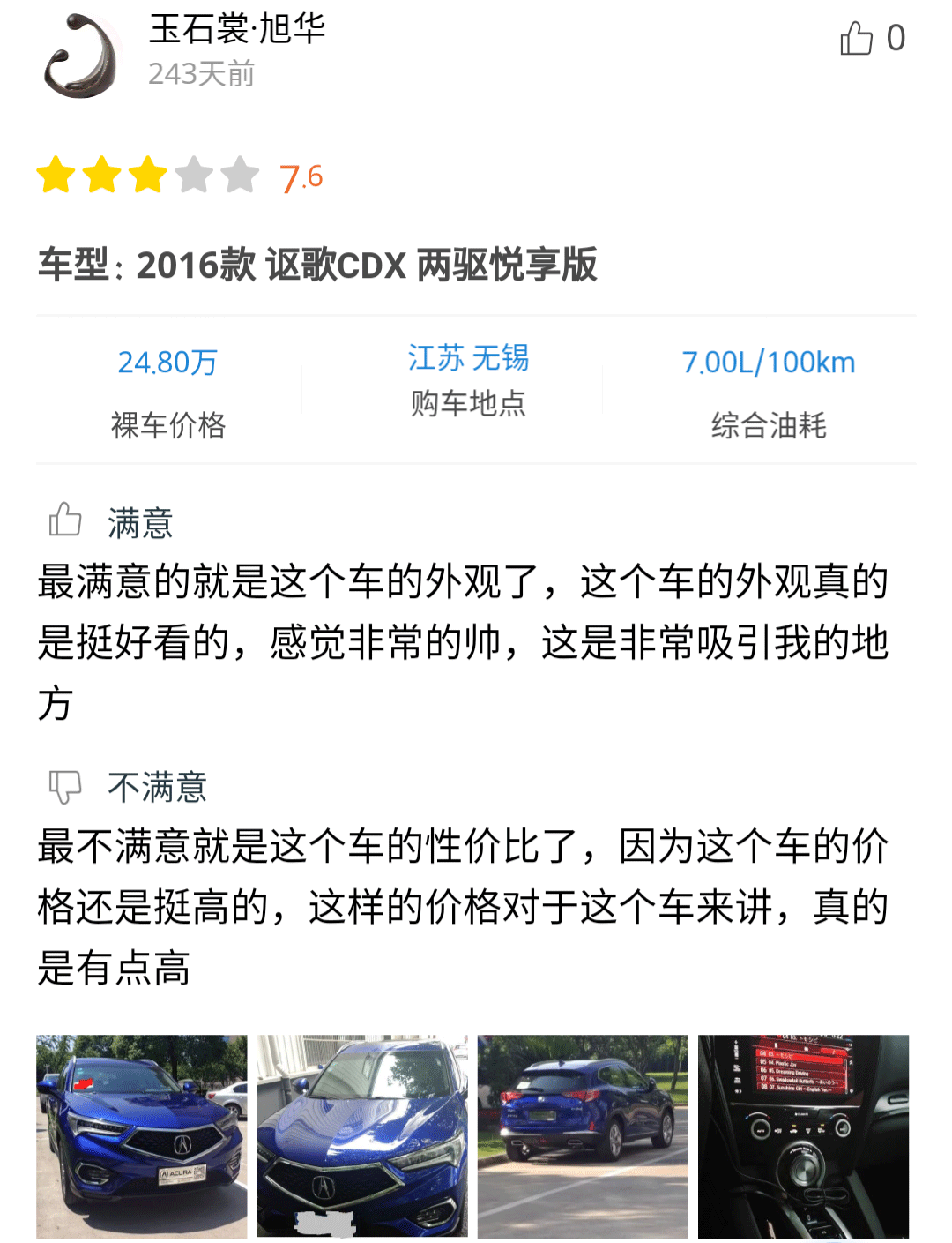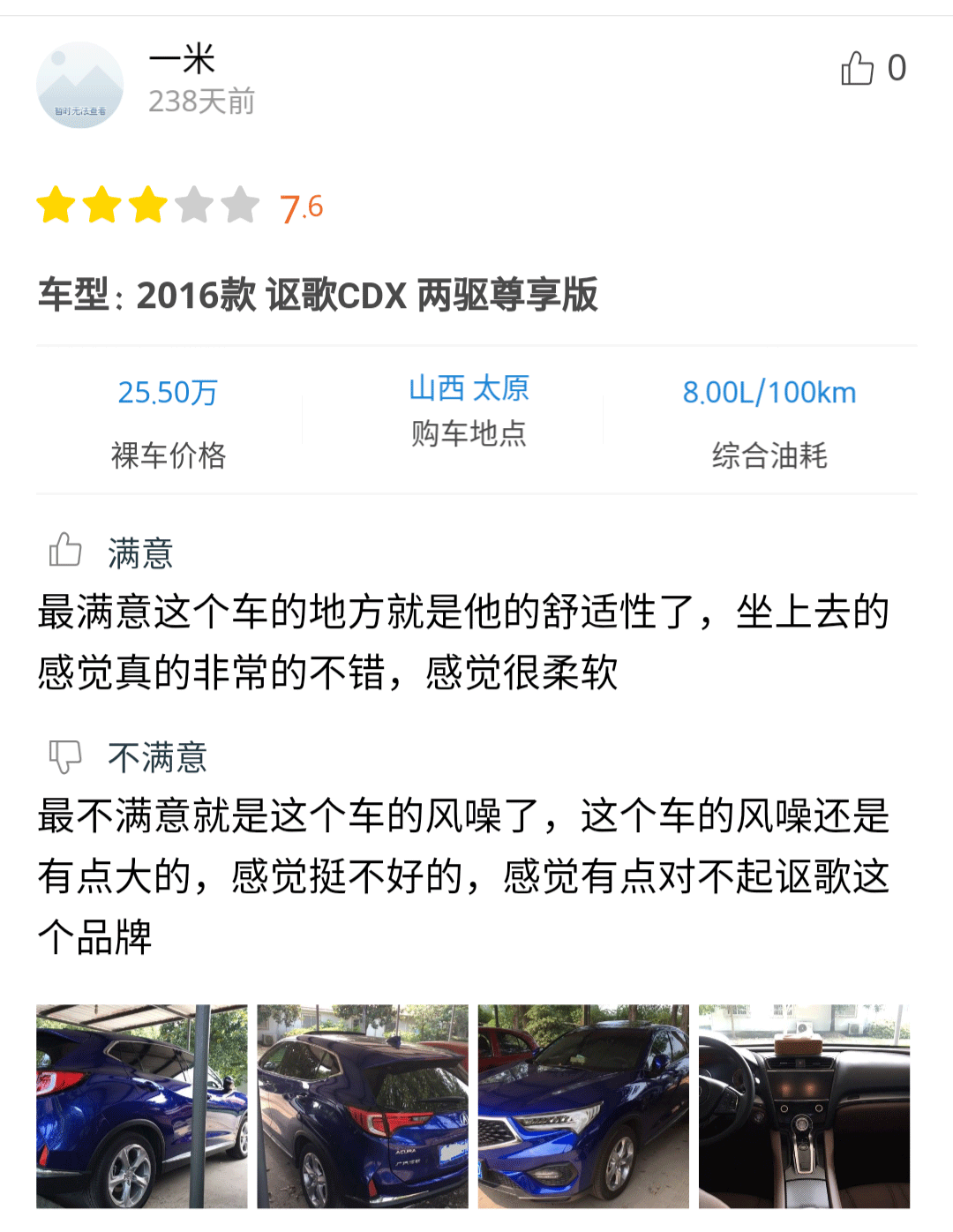 感兴趣的朋友可以点击小程序查看详细口碑,从口碑中可以看到车主们对讴歌CDX的乘坐空间、座椅的舒适度都颇为满意,而且对外观的帅气程度多加赞赏,同时他们反馈的油耗也是较低的。但是有些车主认为它的动力总成有一些迟滞,开起来还不够爽快,另外高速上的风噪也有些明显。