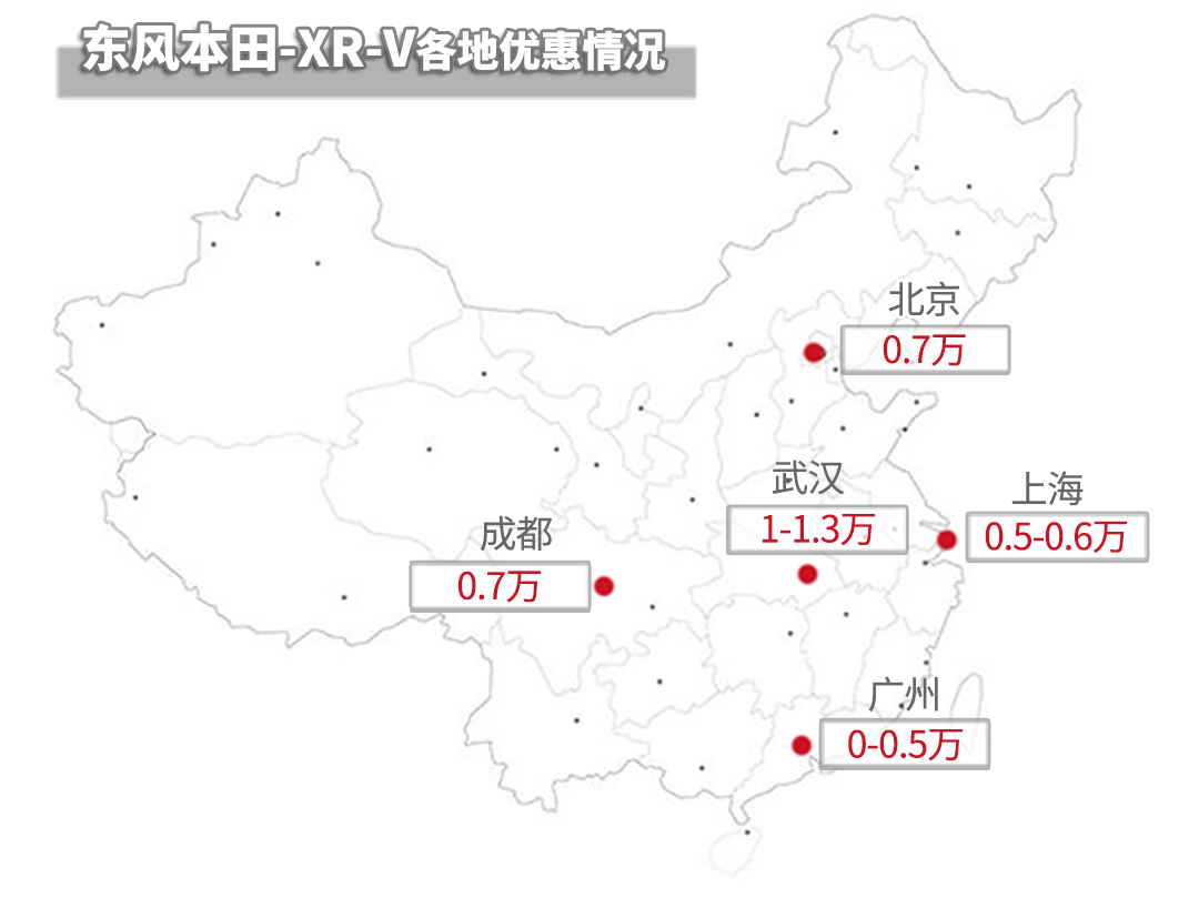 目前来看,XR-V都能有7000块钱左右的优惠,这对于一款每月销量过万台的SUV而言,这样的优惠幅度已然不错。北京,广州和上海都是现金优惠和综合优惠并存,至于武汉和成都则全为综合优惠,综合优惠多数都会要求在店内上保险。