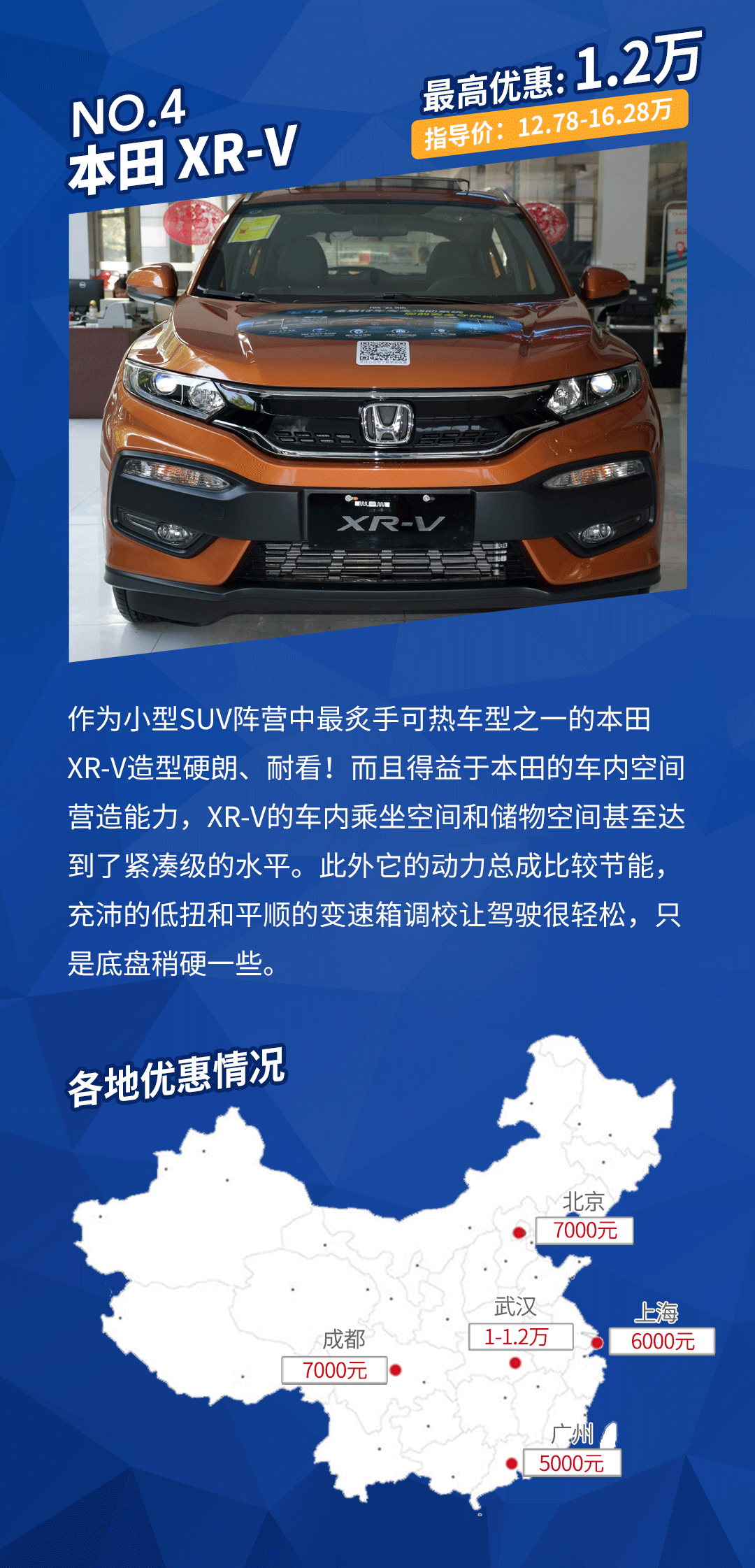本田XR-V优惠详情:在广州地区需要搭配店内上保险、店内上牌等项目。在北京、成都、上海等地需在店内上保险,在武汉地区需搭配加装饰、店内上保险、店内贷款、延长保修、店内上牌等项目。