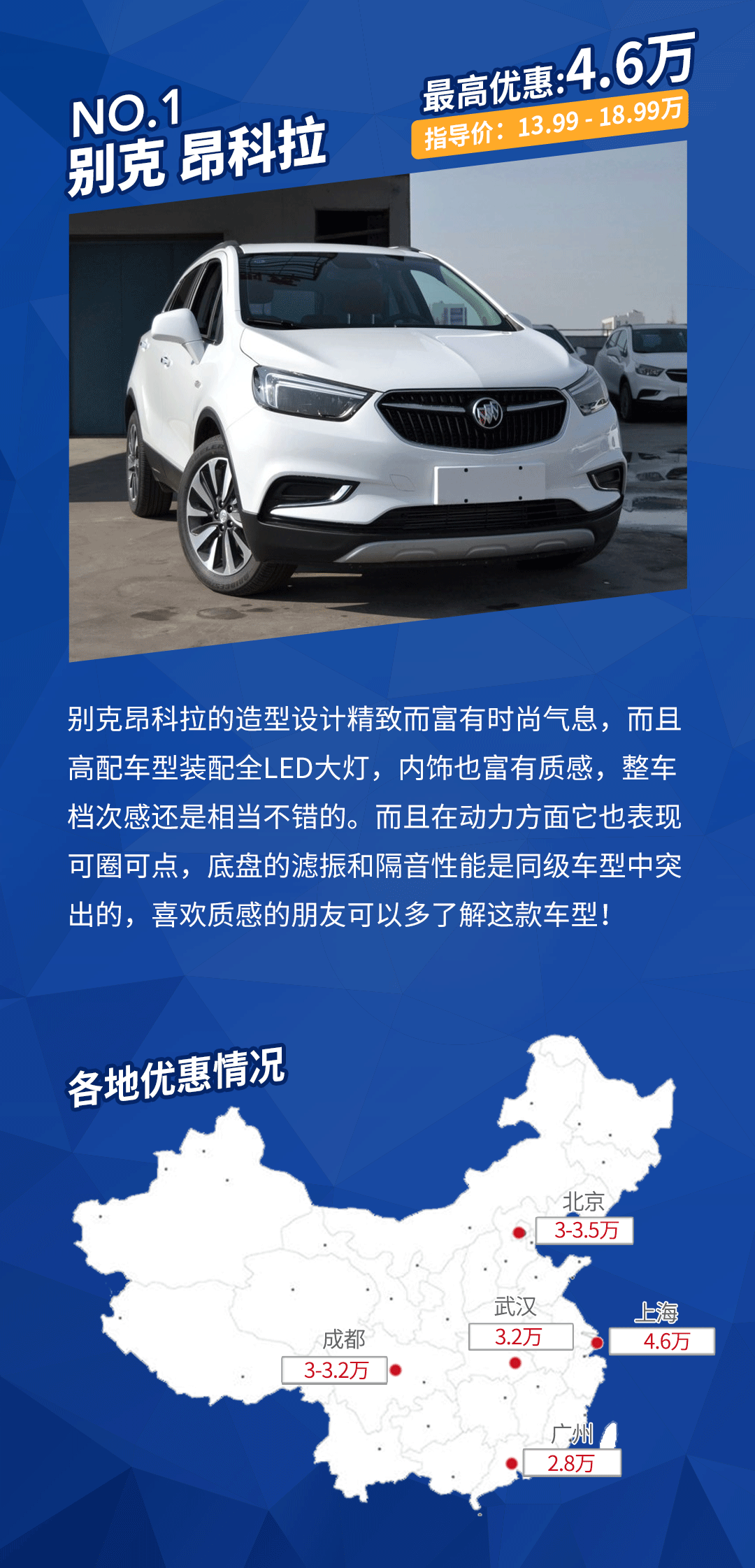 其实排名前三位的劲客、昂科拉、创酷都给出了很不错的优惠幅度,性价比表现真的相当不错了。昂科拉、创酷需要搭配的消费项目会多一些,咱们在买车是要多去留意!现代ix35、智跑这两台全新换代的车型由于售价已直线下降,所以在优惠方面还是不能强求太多!