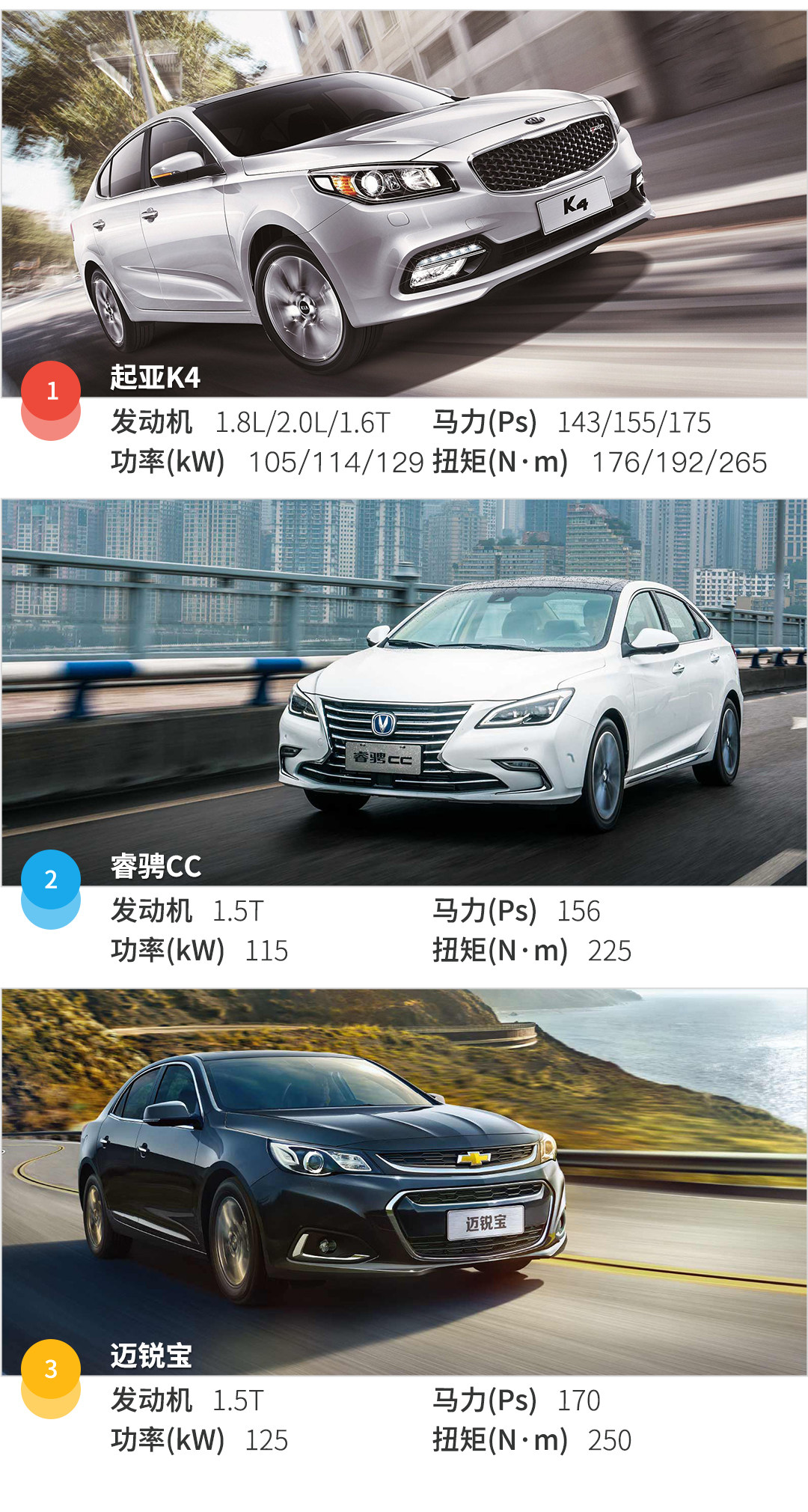 三款车中,睿骋CC和迈锐宝都只有1.5T发动机一款动力配置,起亚K4有1.8L,2.0L和1.6T三种动力规格,睿骋CC使用的是6MT或6AT变速箱,虽说动力算不上强劲,正常驾驶的时候足够应付日常使用,油门调校不算灵敏,需要大动力输出的时候,果断踩下油门,车辆才会给你足够的加速度。K4的1.6T发动机也是同样情况,2000rpm以前动力输出偏慵懒,7速双离合变速箱换挡动作不算快速和干脆,低速的时候还稍有顿挫,不过转向是好评的地方,指向性好,虚位小。迈锐宝1.5T发动机最大马力170Ps,最大扭矩250N*m,与之配合的是6AT变速箱,得益于较大的动力数据,整体加速感觉轻快,车速提升明显,不足的地方是变速箱对于油门开度的响应有点迟缓,简单来说就是升降挡不快。