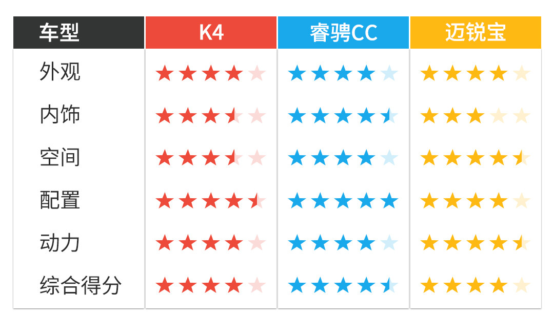 总的来说,睿骋CC是注重配置的人群最好的选择,喜欢动力,驾驶起来激情的消费者选择迈锐宝会符合您的预期,如果喜欢实用,配置相对丰富的K4会满足您。12万起就能买到中型车,还买什么威朗高尔夫?