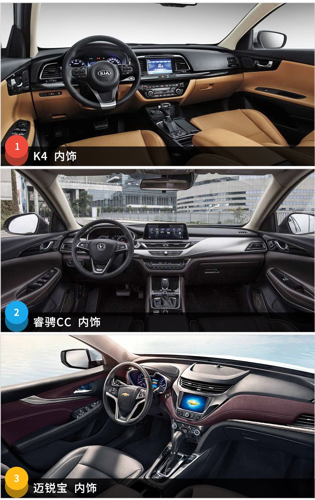三辆车的内饰各有千秋,迈锐宝是传统的对称式飞翼设计,和老款环抱式相比,利用率上会好一点。K4的中控台式传统的轿车风格,好处在于能够符合大部分消费者的喜好,并且使用双色设计,下方使用棕色材料,显得更加高档,所有功能的易用程度是三辆车中最高。睿骋CC的内饰是三辆车中科技感最强的,上中下均使用不同材质凭借,再加上分区明确的设计风格,无论是使用还是视觉效果都不错。