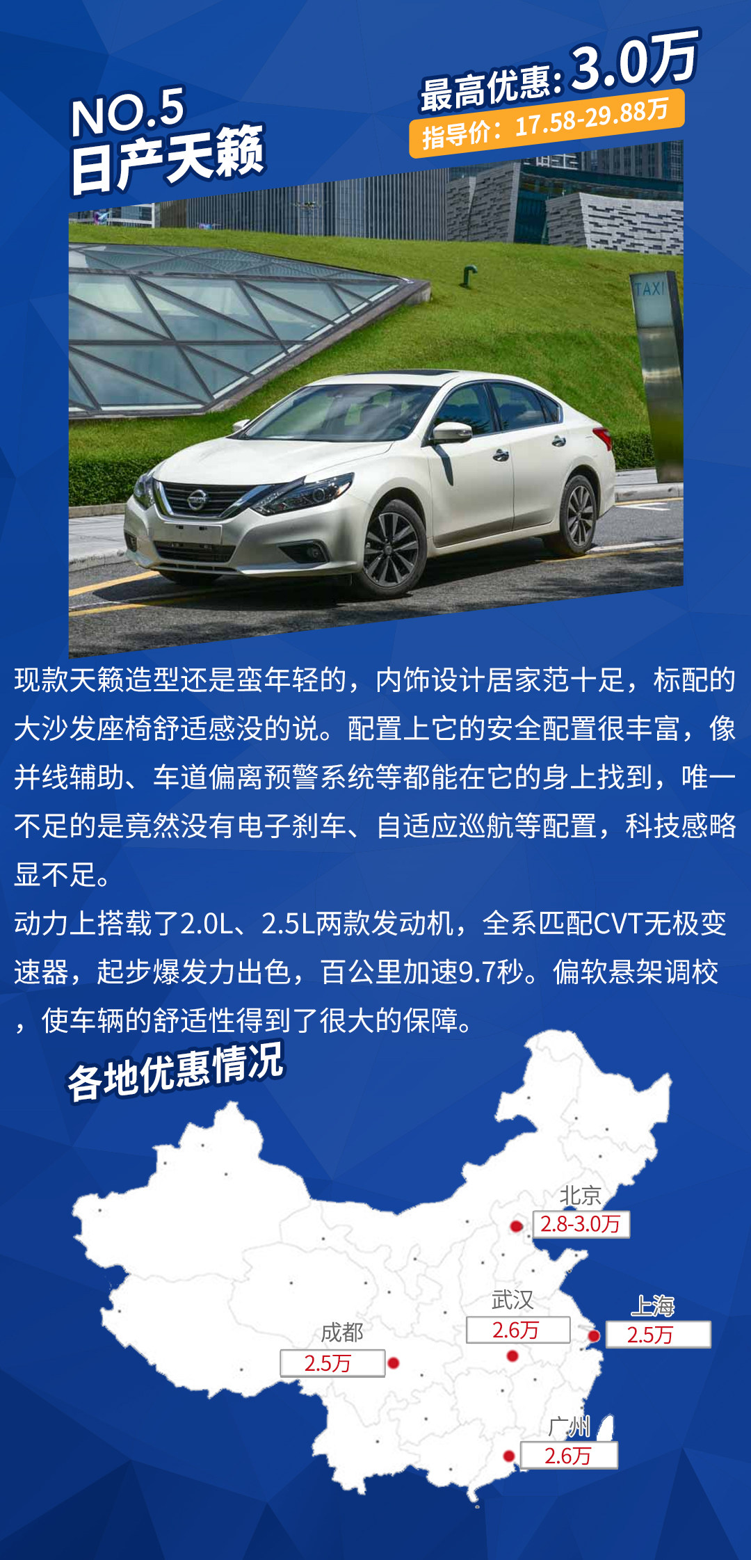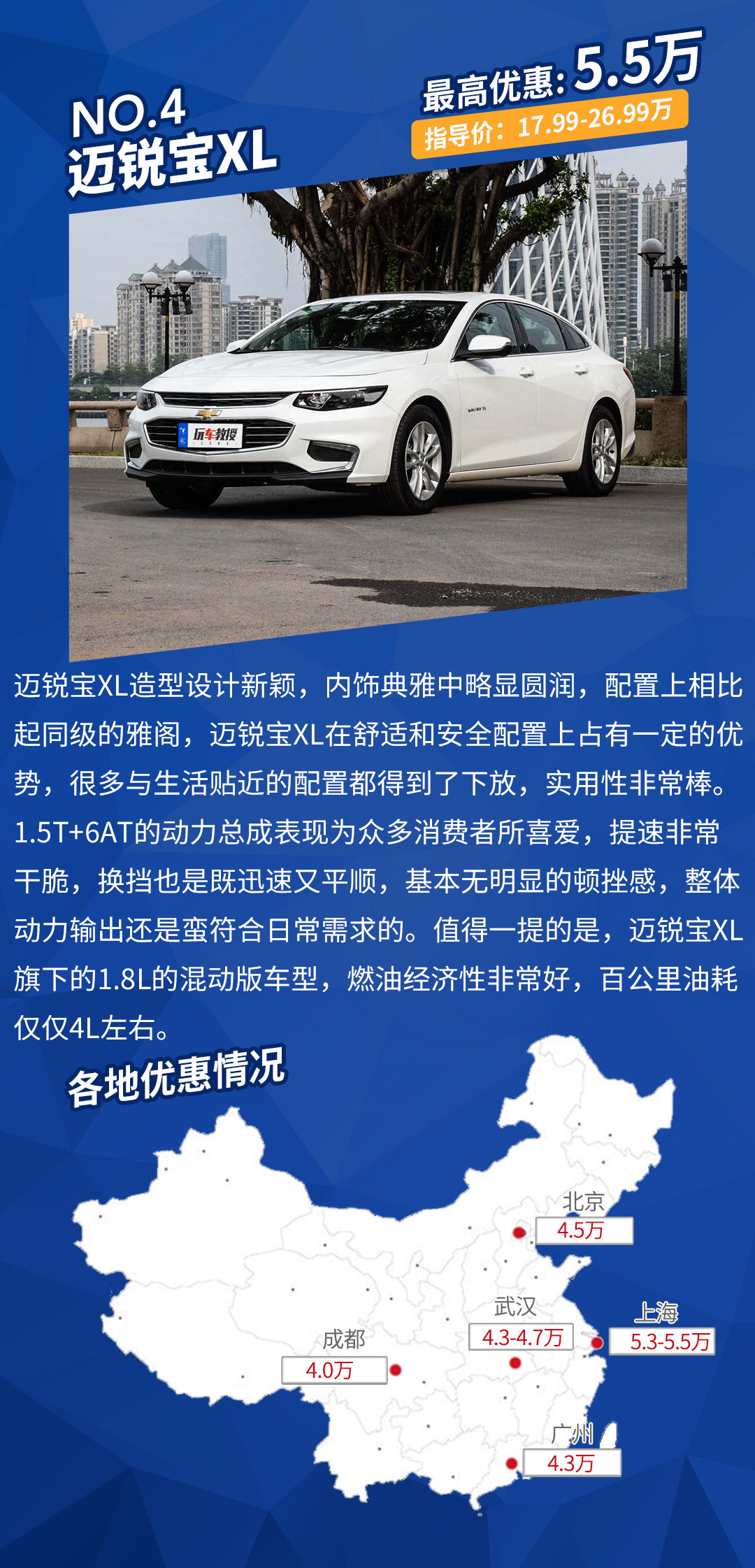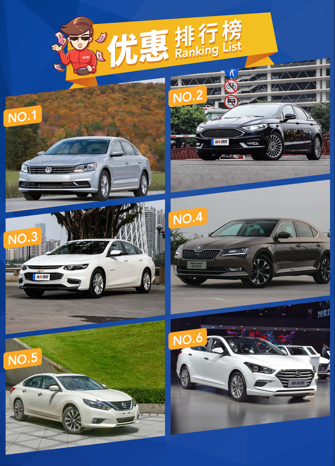 相信通过上面的优惠排行榜,大家对这6款中型车的优惠排名已有所了解,那么这6款车具体有什么样的表现,优惠力度怎么样呢?我们接着往下看
