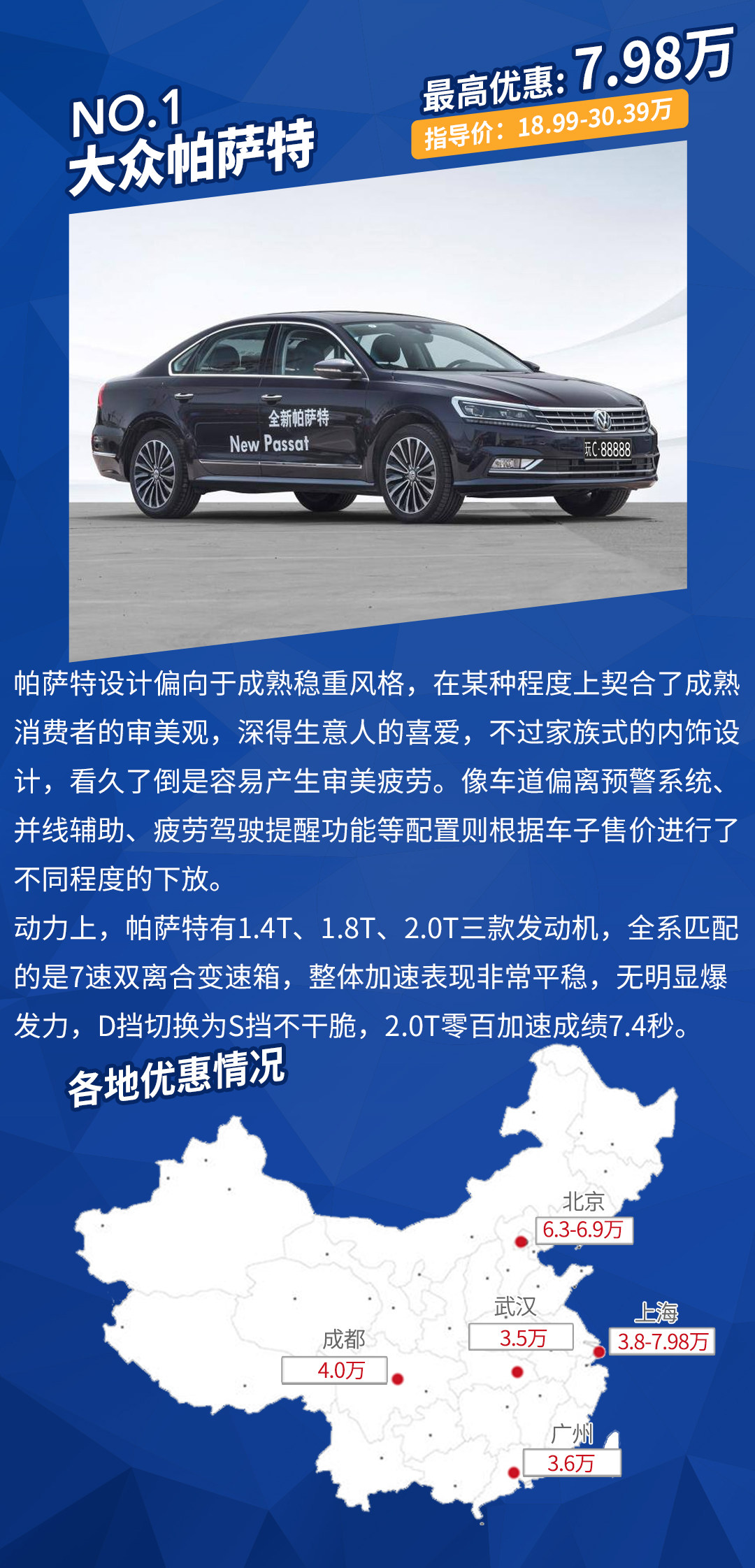 帕萨特优惠详情:2017款帕萨特虽然在北京的优惠力度最大,但是必须搭配店内上保险、店内贷款、店内置换、购买礼包、购买精品等多个消费项目,而且还必须持有本地驾照(感觉有点霸王条款);在成都和广州地区则以现金优惠居多,并且无附属优惠条件;上海地区优惠搭配的优惠条件是比较常规的三类—店内上保险、店内贷款以及店内上牌三个项目。