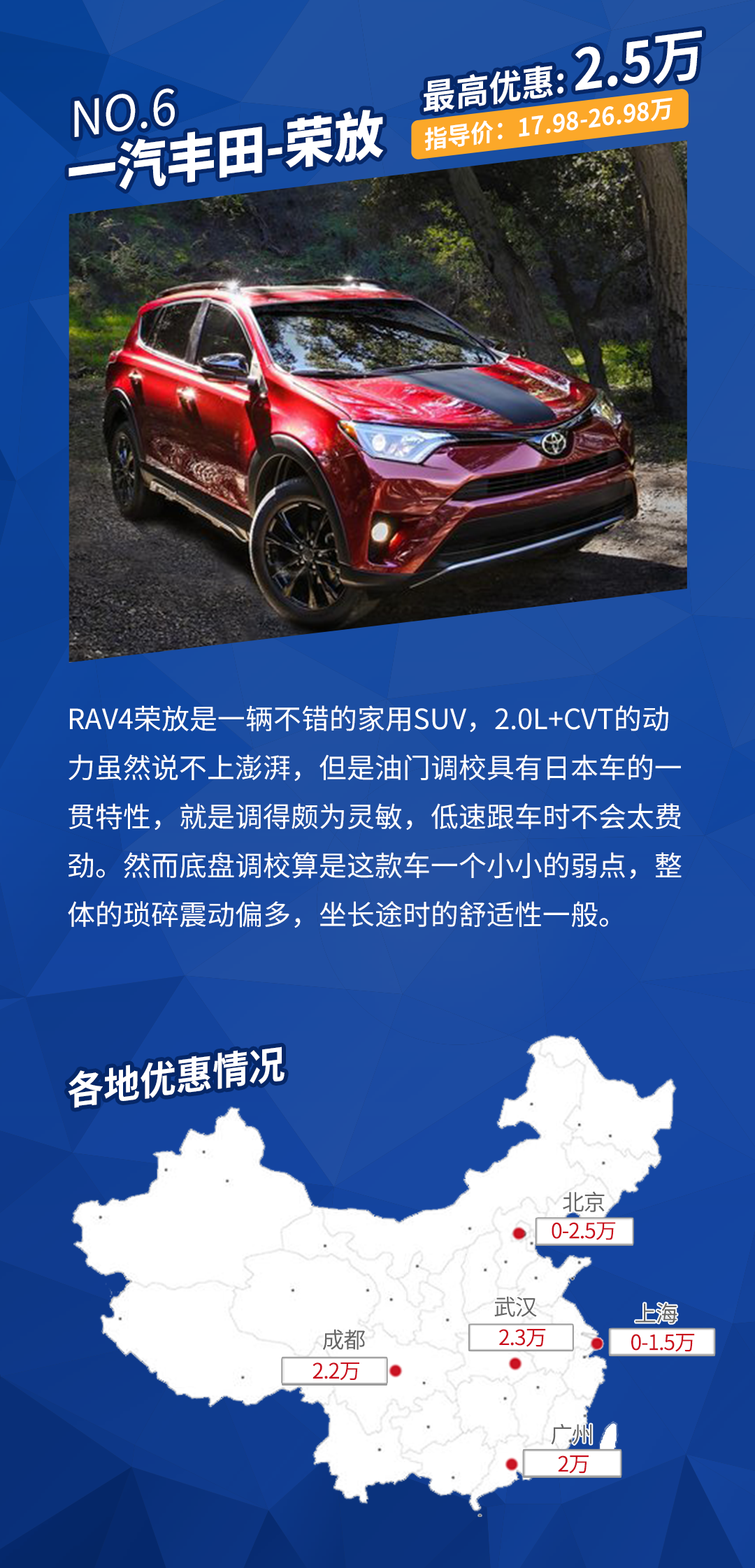 北京地区来看,RAV4荣放的优惠能有2.5万元左右,不过除了两家是现金优惠外,其余均为综合优惠。上海的优惠幅度没有北京大,综合优惠有4家店,其余都是现金优惠。武汉全是综合优惠,成都全为现金优惠,广州则两种方式都有。