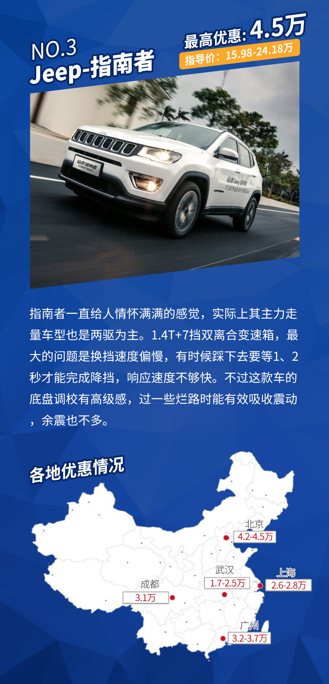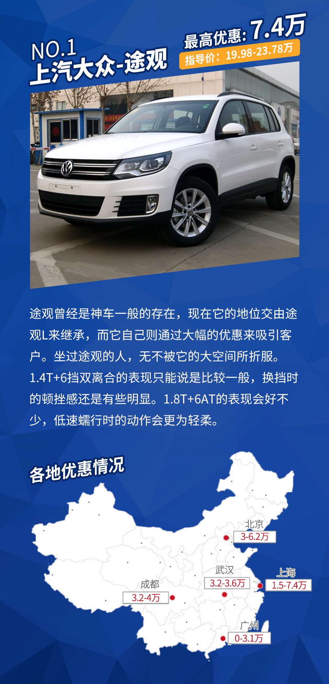 途观在北京的优惠大多都有5万元左右,不过全部都是综合优惠。在途观的大本营上海,其优惠幅度更加惊人,除了两家店是现金优惠外,其余都是综合优惠。武汉和成都的4S店全都是综合优惠,广州的现金优惠会多一点。