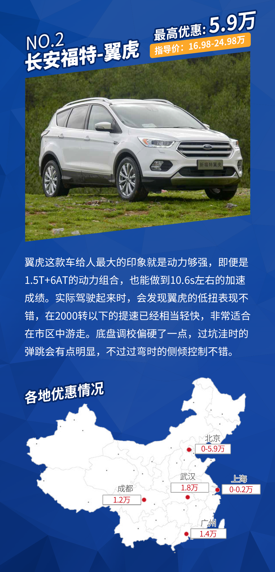 翼虎在北京地区的优惠幅度最为惊人,动辄都能有超过4万块钱的幅度,不过大多都是综合优惠,需要店内上保险和店内上牌等。上海和广州的4S店现金优惠比较多,武汉全是综合优惠,而成都有6家店是综合优惠,剩下6家则是现金优惠。