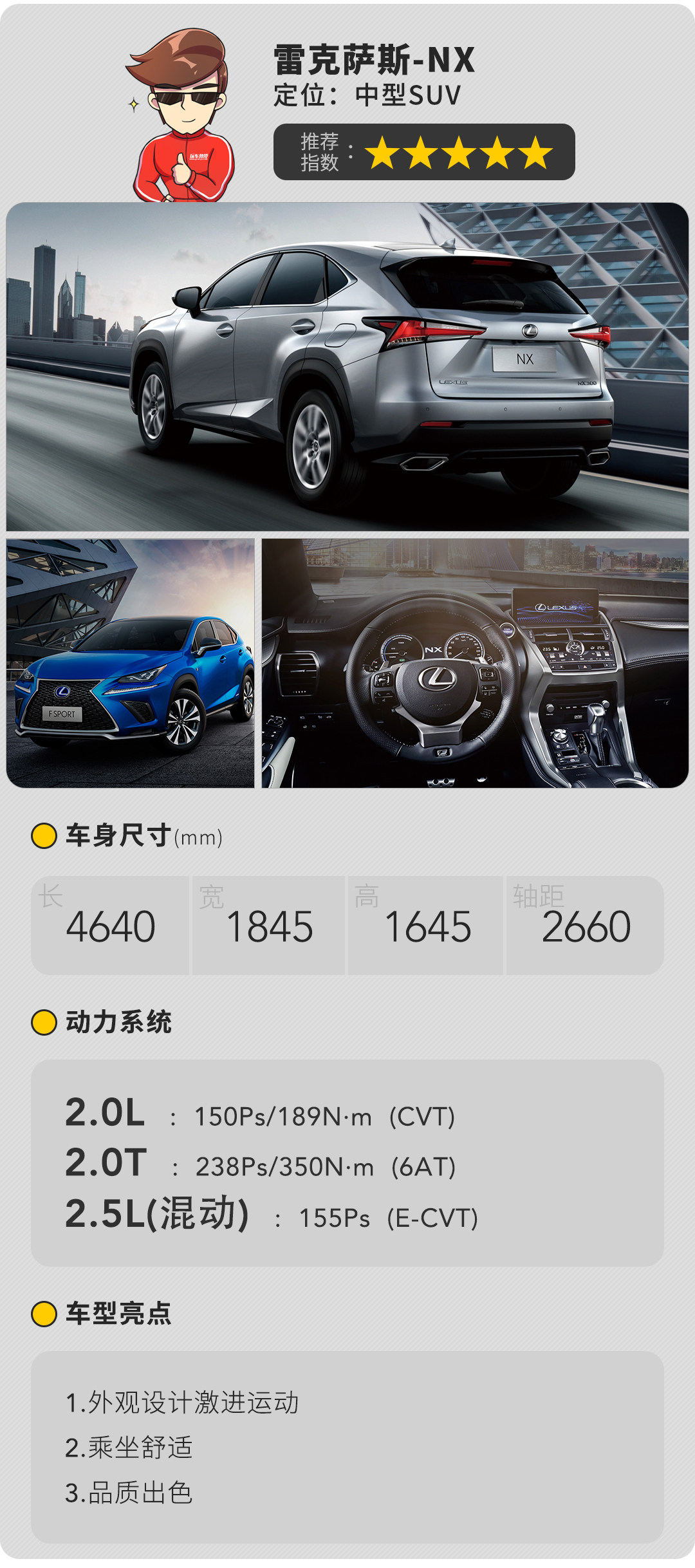 NX这款车是典型的“纸老虎”,外形看起来相当运动,实际驾驶起来时则发现它是挺温顺的。2.0L+CVT的动力,别说爆发力,连日常超车时都要留足距离。不过这套动力总成最大的优点是平顺,无论是低速蠕行还是急加速降挡,CVT变速箱都可以处理得有条不紊。