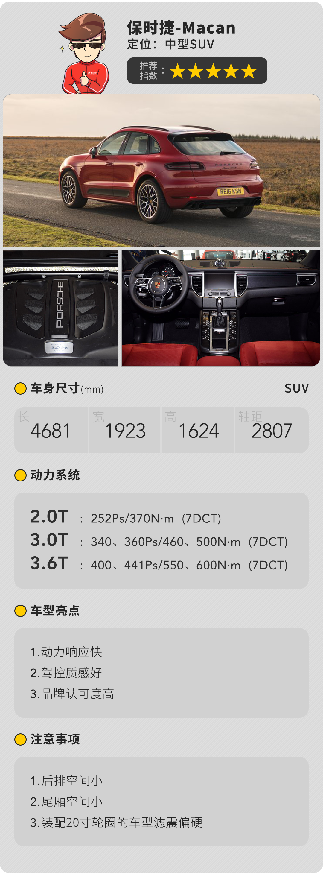 Macan一直都是豪华运动中型SUV的代表,即便是入门的2.0T+7挡双离合,其零百成绩也可做到6.7s,比不少小钢炮都要更快。在转向的调校方面,Macan轻重适宜,路感清晰。