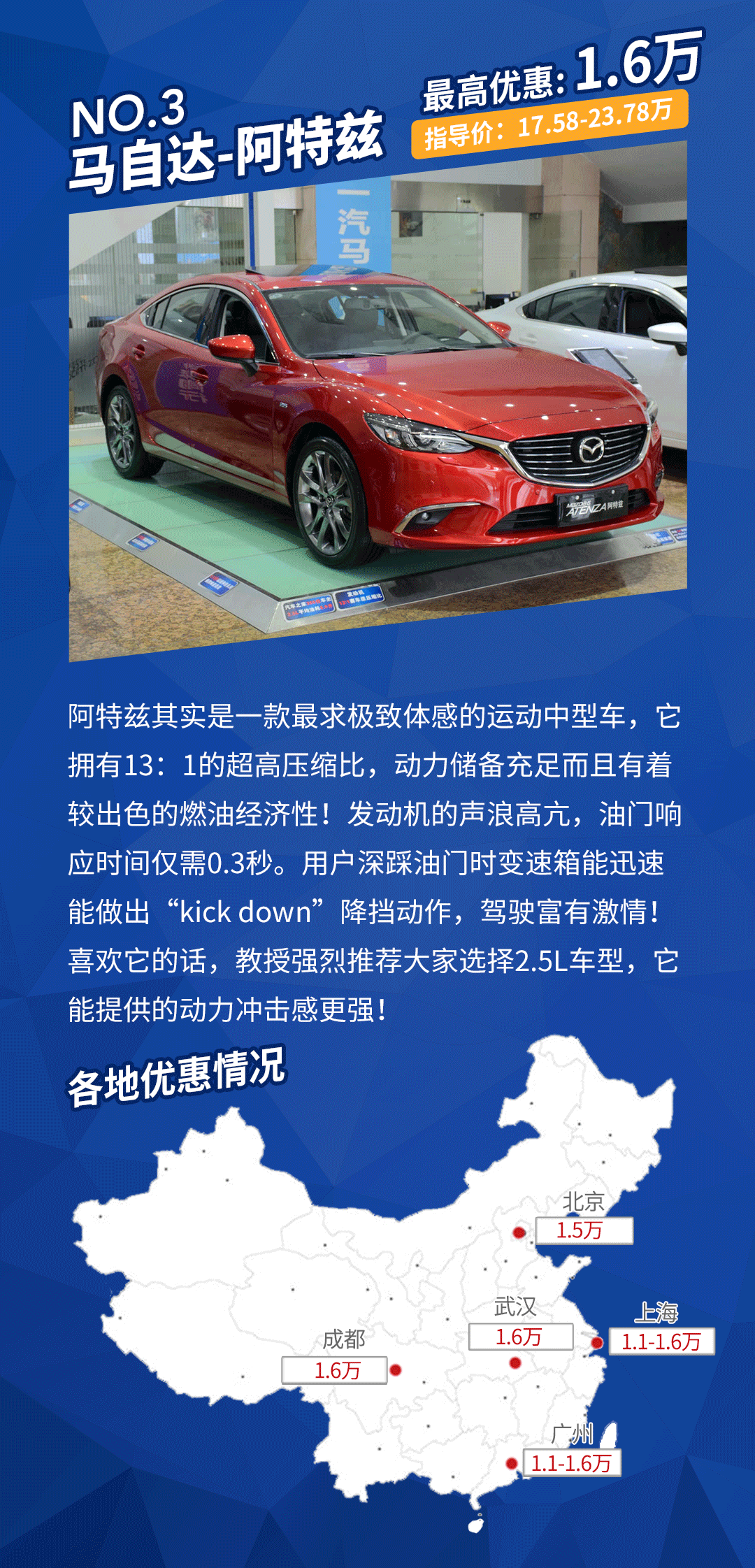 阿特兹的定价其实还算厚道,现在给出了最高1.6万的优惠幅度,性价比略有提升,与同级对比这样的幅度自然占不了优势,但对于马自达的粉丝来说,总比没有好吧!