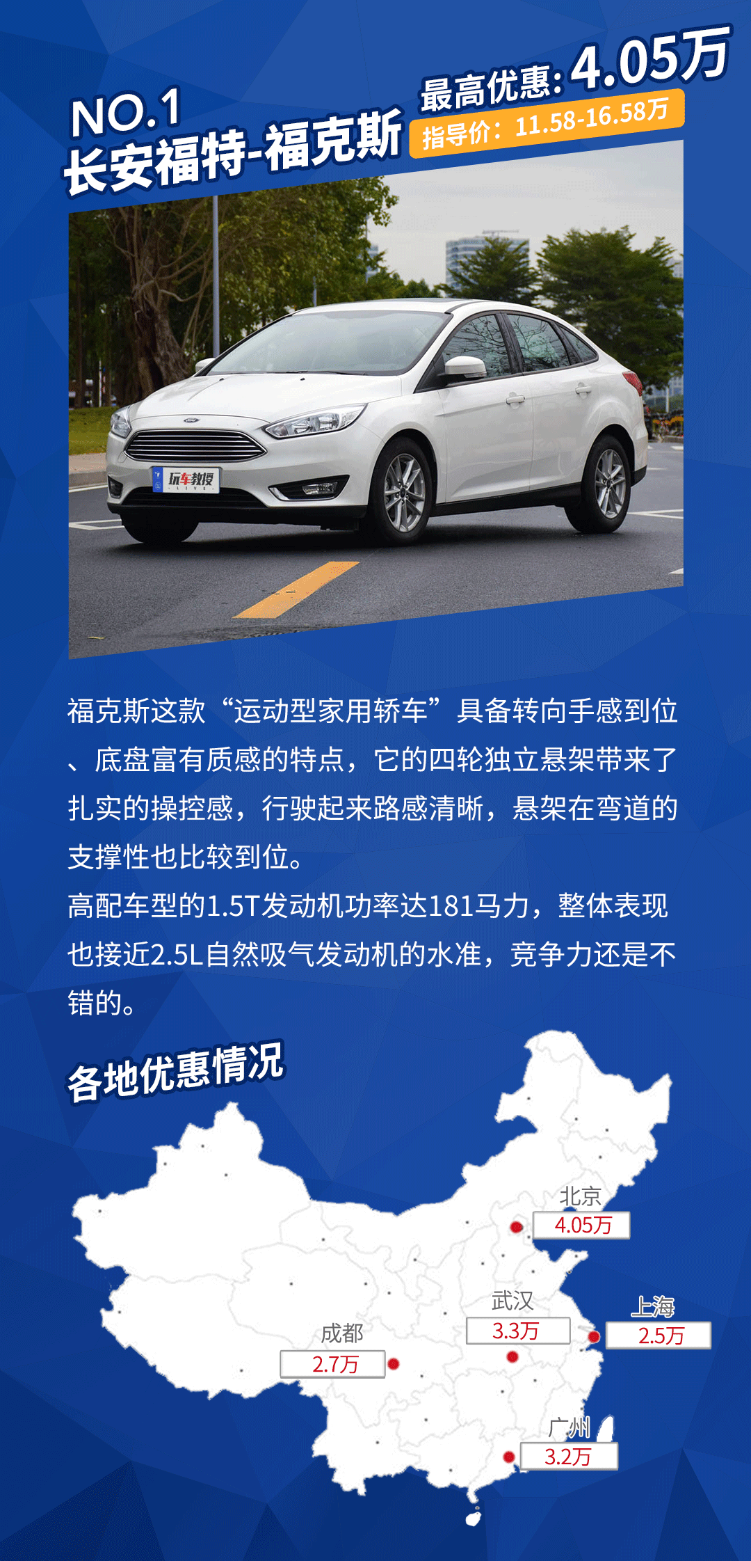 我们可以直观地看到紧凑型车当中福克斯和凌渡这两款运动风格突出的车型优惠是相当给力的,喜欢驾控感受的话,大家可以优先考虑着两款车型!而且中型轿车市场,迈锐宝XL和君威这两款车型在有些城市的优惠幅度已经相当吸引,也多为现金直接优惠,觉得紧凑型轿车不能满足要求的话,可以多去了解这两款车型,它们在行驶品质、运动性方面都有着不错表现!