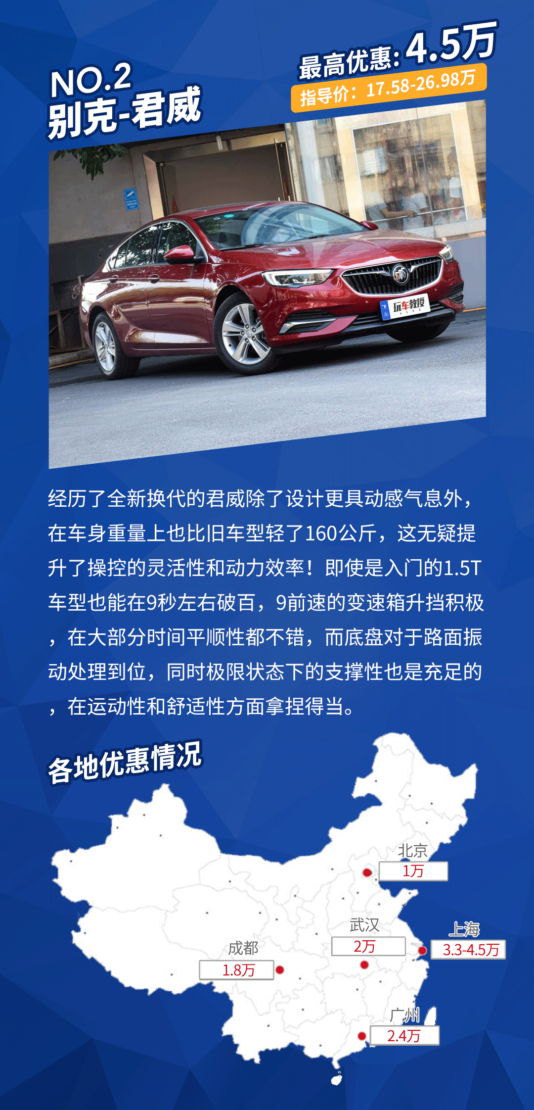 在广州和上海这两个地区,君威的现金优惠幅度还是相当给力的,在这些地区的朋友可以多考虑这款车型是,它在优惠过后性价比真的不错!