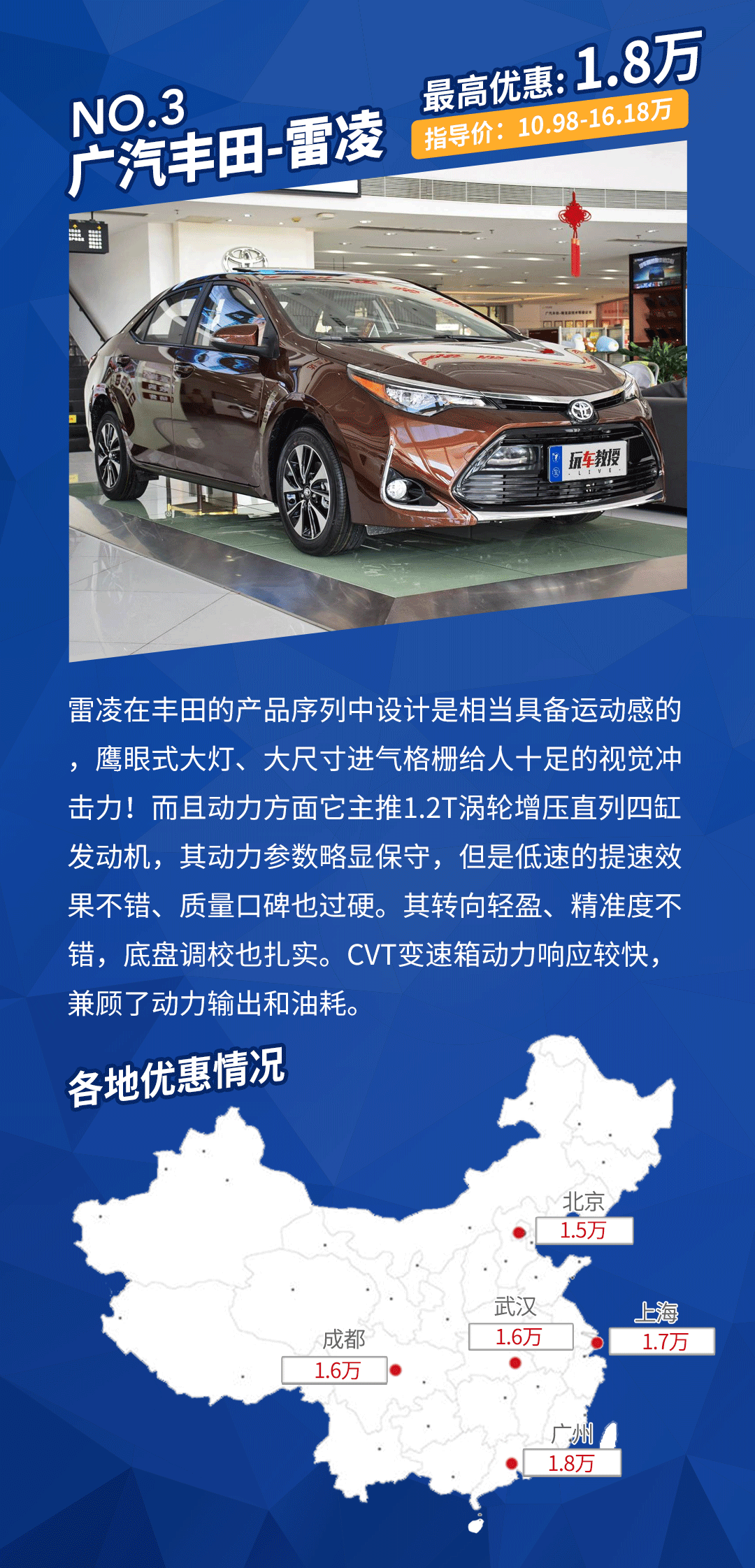 雷凌优惠详情:在广州、上海、成都地区雷凌以现金优惠为主,在北京则需要在店内上保险。在武汉地区则需要在店内贷款。