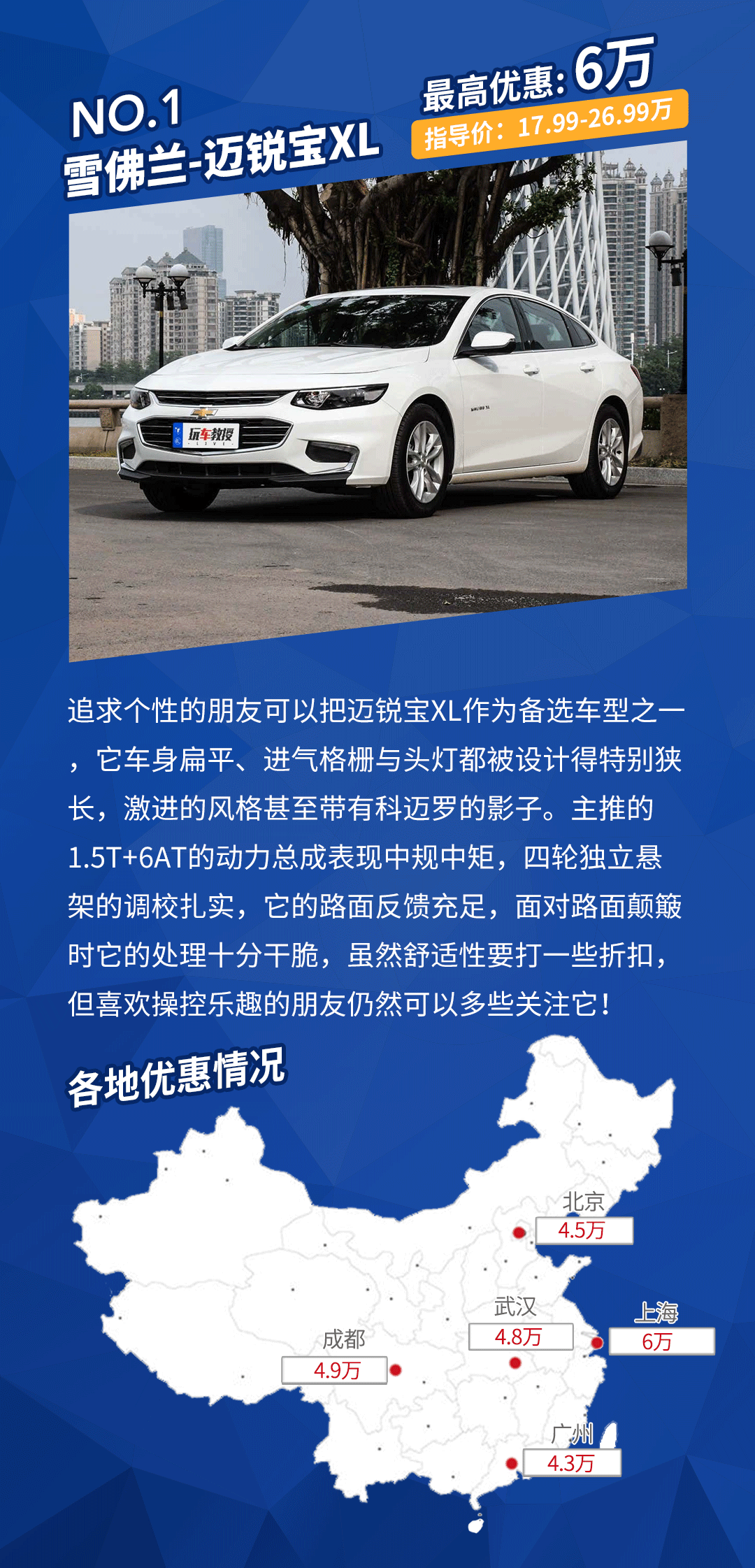 显然迈锐宝XL在各大城市都给出了大幅度的优惠,尤其在广州、成都和北京地区优惠给力,也不需要搭配太多消费项目,如果觉得紧凑型轿车的空间不能满足自己的话,迈锐宝XL真是一个不错的选择!