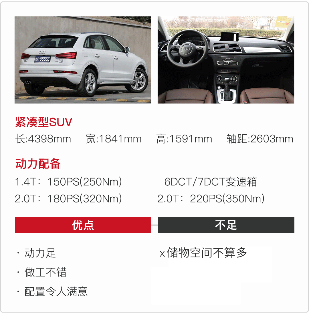 奥迪Q3这款车型具乘坐空间够用、动力充足、操控性灵活等多项特点。而且作为奥迪品牌的入门SUV车型它的做工品质水准也相当不错。现款奥迪Q3造型更显动感,入门车型搭载1.4T+6速双离合的动力总成,其降挡速度很快捷,动力输出灵敏,它随时能帮你连降3、4挡,驾驶起来很爽快!