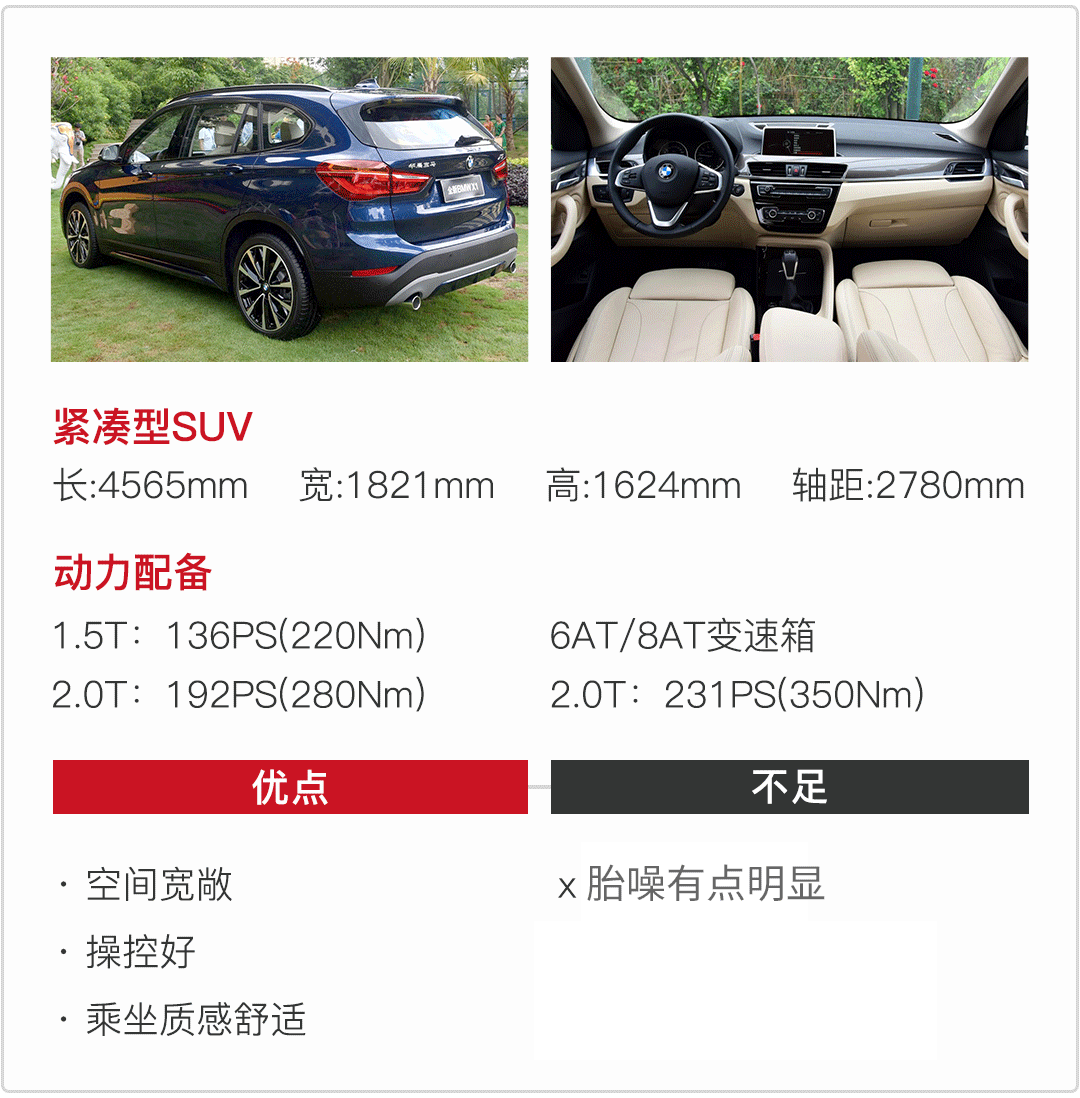 车型点评:宝马X1是一款完成针对家用消费者而打造的SUV车型,它的尺寸和空间基本上都是同级领先的,而且在行驶品质上也拿捏得当!所以作为一辆家庭用车的话,它相当称职!