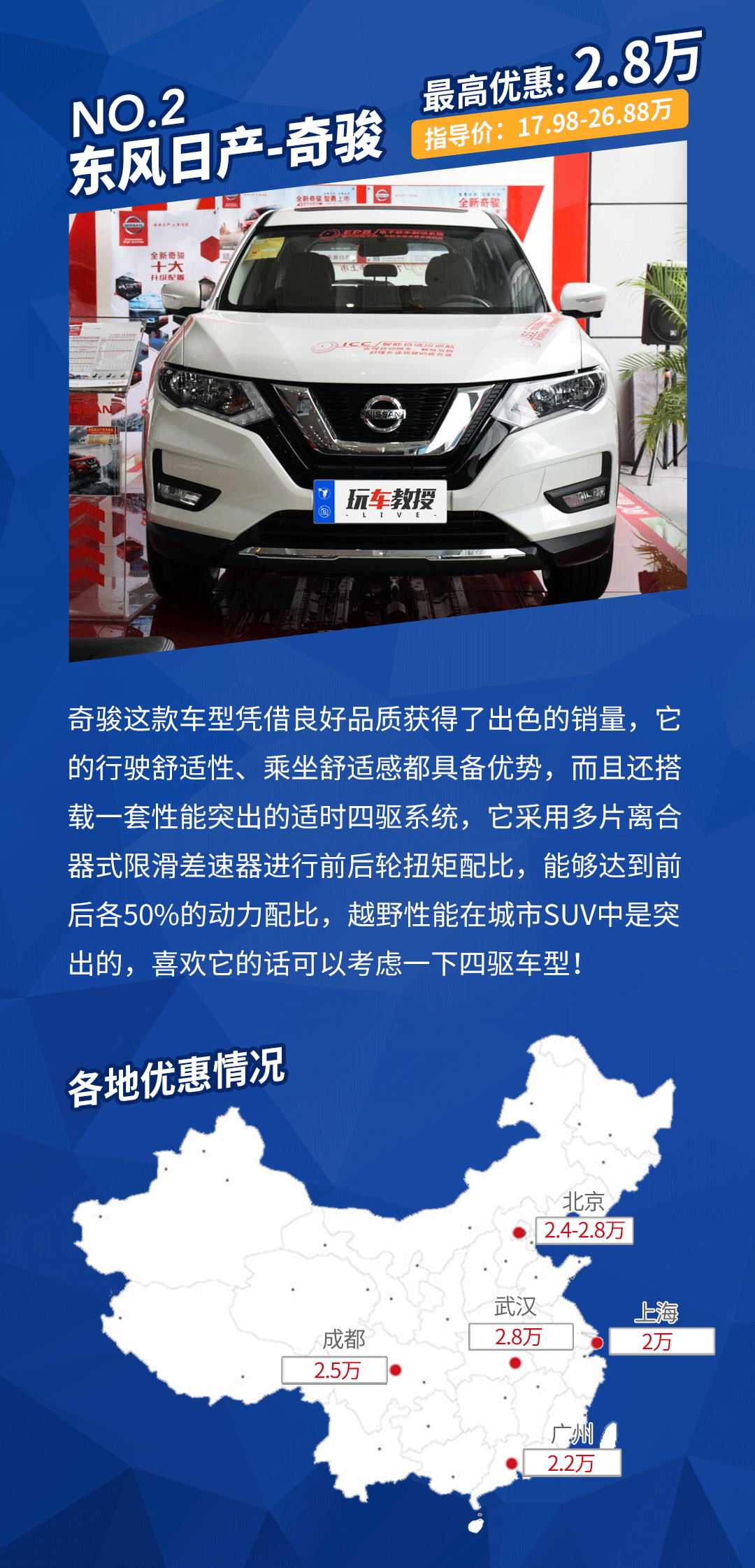 车型点评:奇骏的舒适度和空间实用性一直是紧凑型SUV中的一流水平,而且在武汉、成都和上海地区都给出了现金优惠,优惠过后性价比表现相当不错!所以在这三个地区的朋友可以多考虑它。