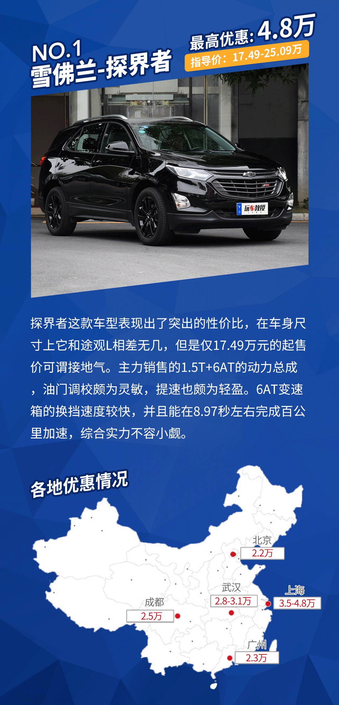 车型点评:考虑到探界者的起售价仅为17.49万元,现在也给出可观的现金优惠政策,尤其是在广州、成都地区采用了现金直接优惠的方式,所以对于消费者来说还是相当实惠的。而且它1.5T车型油耗不高、动力性能也相当于以往的2.4L自然吸气水平,对于喜欢美系车型的朋友来说,真的可以多去留意它!