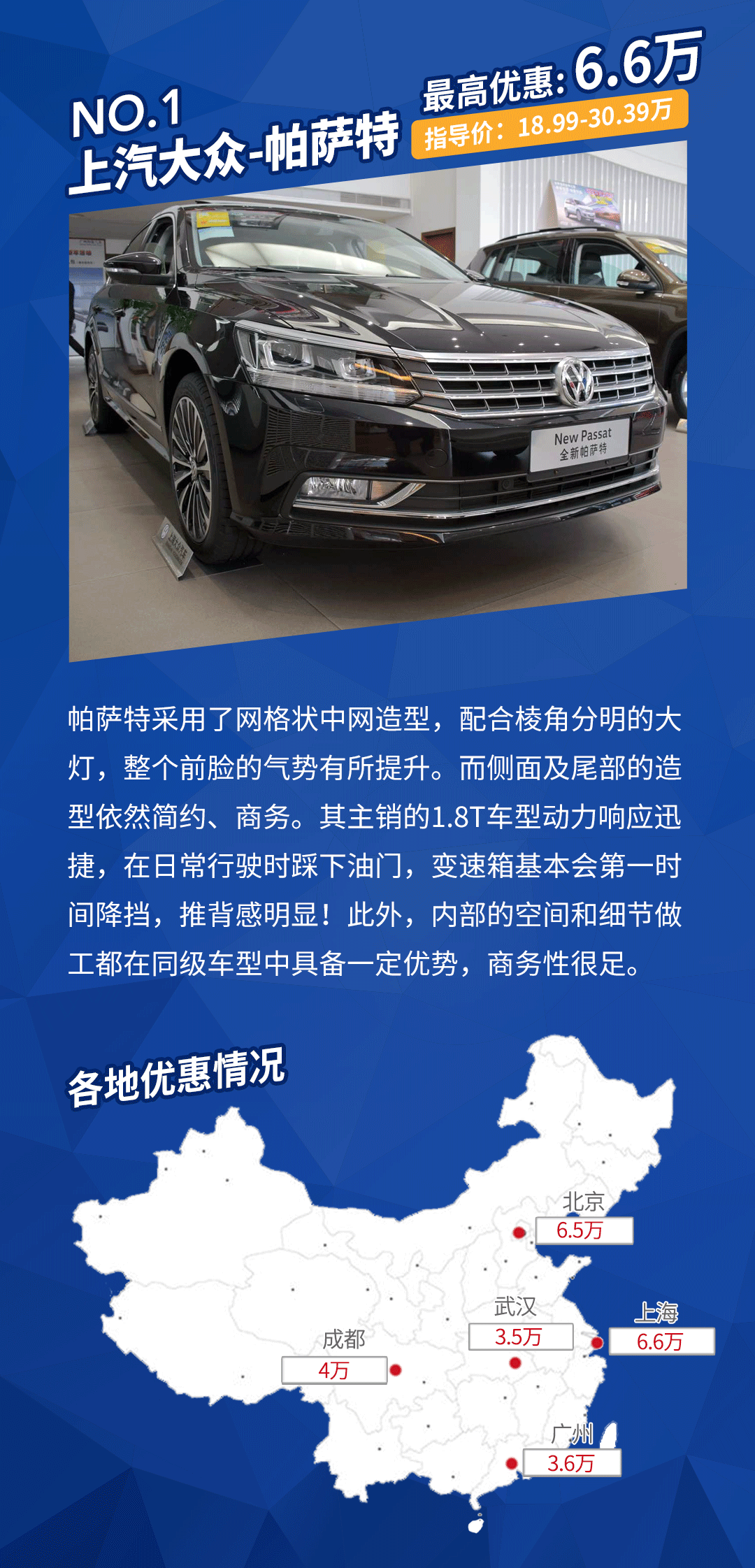 帕萨特优惠详情:在广州地区挺仅需搭配店内上保险的项目,在北京、上海地区则需要搭配加装饰、店内上保险 、店内贷款、店内上牌、店内置换、需购买礼包等多个项目,似乎是有点水分的。在武汉地区则搭配加装饰、店内上保险、店内贷款、延长保修、店内上牌等项目。在成都地区也是需要在店内上保险、店内贷款、店内置换。
