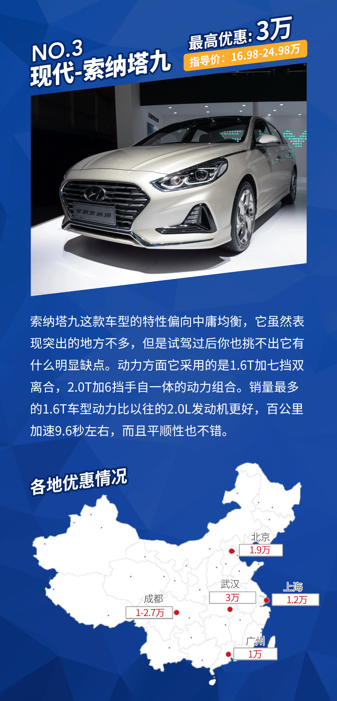 车型点评:索纳塔九在武汉地区的优惠无疑是最大的,所以在该地区的朋友真的可以多多考虑这款车型。考虑到索纳塔九的定价并不算高,所以优惠幅度不大也是可以理解的。