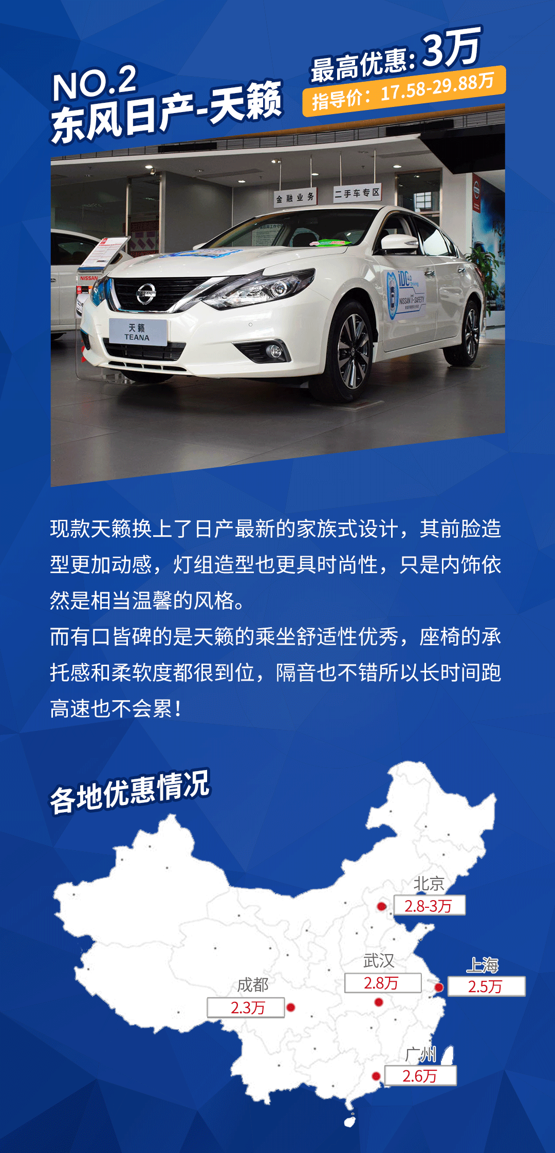 车型点评:天籁在卖得很不错的广州地区需要搭配的消费项目有点多,而在北京、上海、武汉都给出了不低的现金降价幅度,它无疑是一款性价比不低且舒适性突出的家用B级车。而新一代天籁将在下半年推出,不着急买车的朋友可以期待一下。