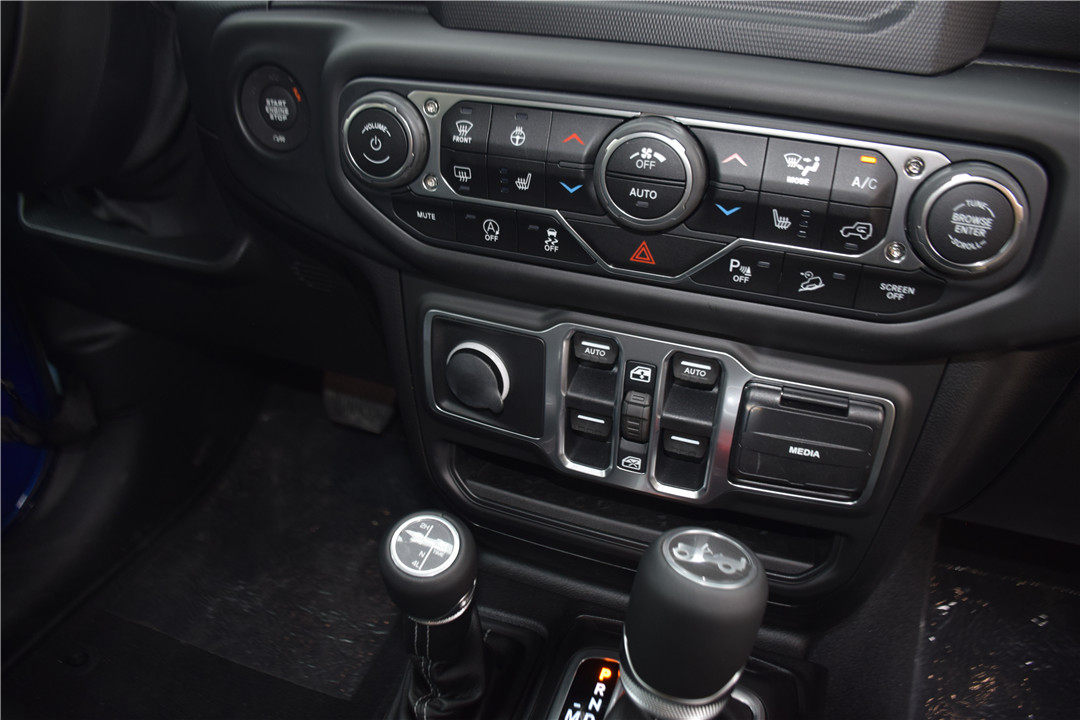 四个车窗的升降按键均位于中控台上,目的是为了简化可拆卸车门的电路机构,提高可靠性,撒哈拉车型中控台下方缺少了卢比肯车型的前后桥差速锁和防倾杆断开按钮
