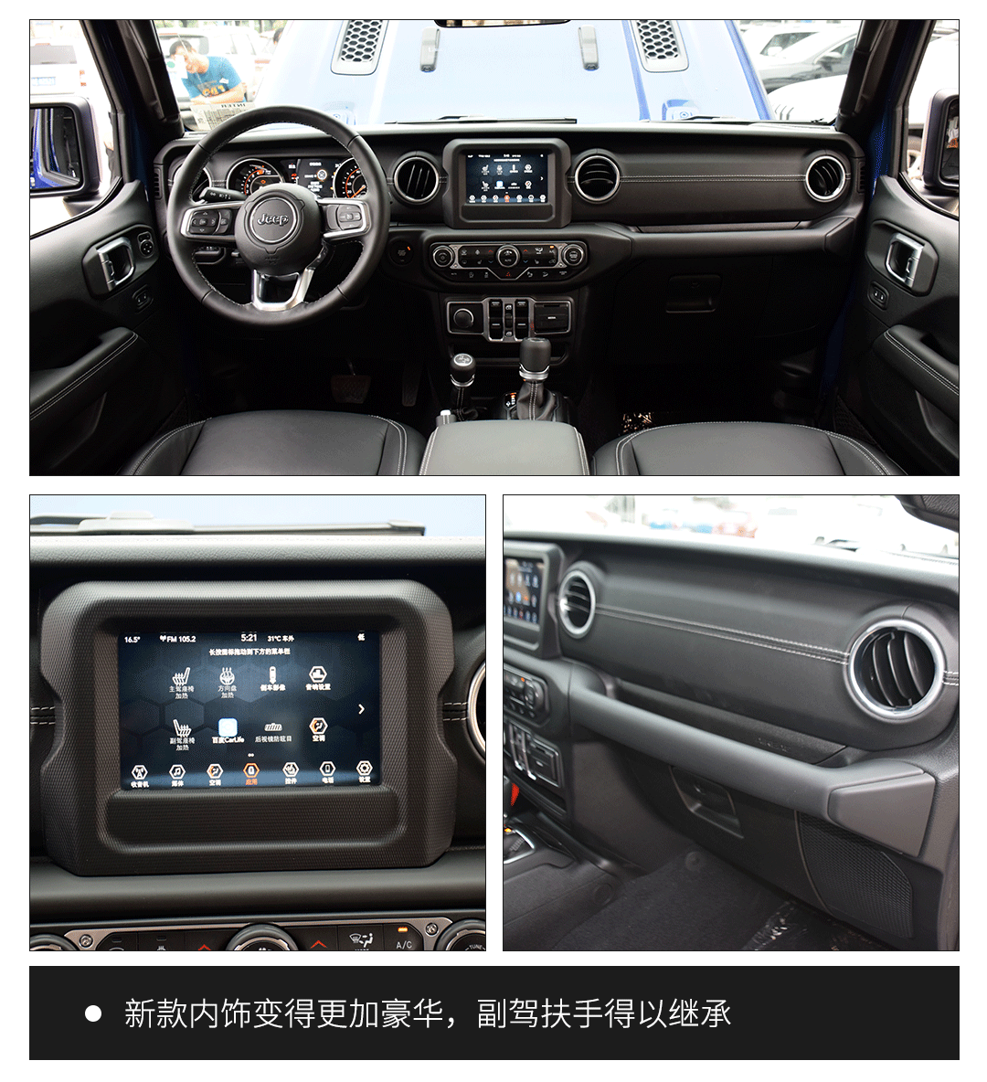 内饰与老款相比变化就很大了,虽然内饰设计对越野能力影响不大,但新款的风格明显比老款在主观感受上要更加豪华。方向盘样式变得更加时尚,液晶仪表盘和中控大屏慕的加入则是牧马人与时俱进的体现,内饰面板和车门上都比老款采用了更多皮质和软性材质覆盖面