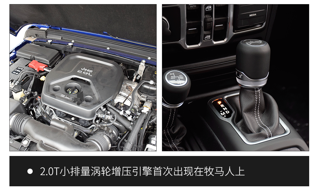 动力系统也是新款牧马人变化的重点,实拍车型采用克莱斯勒-菲亚特集团最新研发的2.0T涡轮增压汽油机,也是牧马人首次采用小排量涡轮增压引擎,最大功率268马力,最大扭矩400牛米,数据和老款3.0和3.6自吸车型相差不大,不过肯定更为省油。变速箱由老款奔驰技术的5速手自一体升级为ZF的8速手自一体变速箱,公路表现应该优于老款,更多档位更绵密的齿比也利于省油