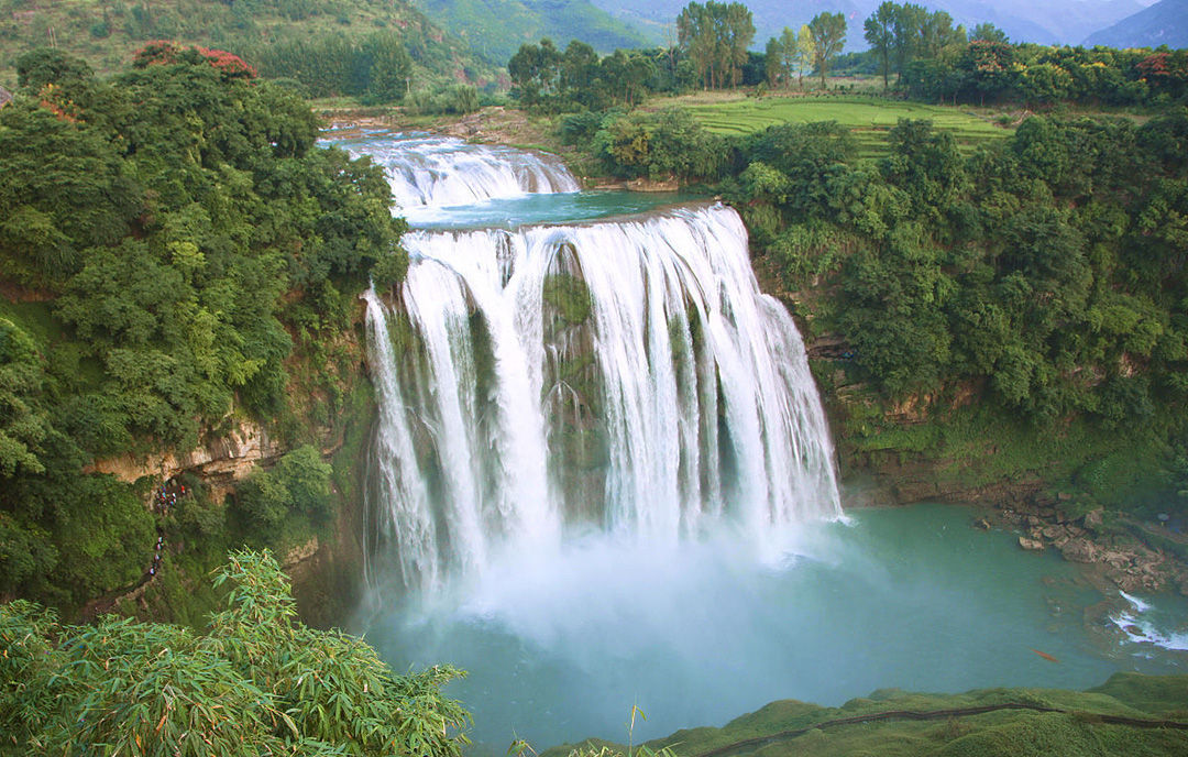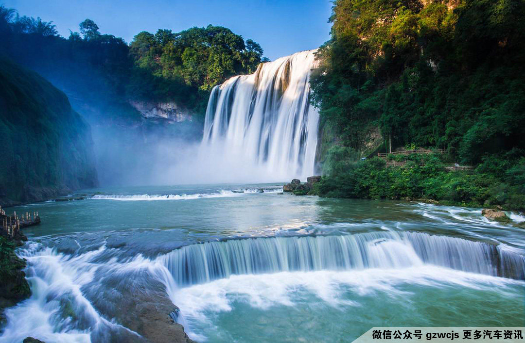 黄果树大瀑布是黄果树瀑布群中最为壮观的瀑布,是世界上唯一可以从上、下、前、后、左、右六个方位观赏的瀑布,也是世界上有水帘洞自然贯通且能从洞内外听、观、摸的瀑布。现在正值瀑布的丰水期,此时的黄果树瀑布,气势磅礴,水雾迷蒙,在阳光照射下时有彩虹出现,变化无穷,令人赞叹。