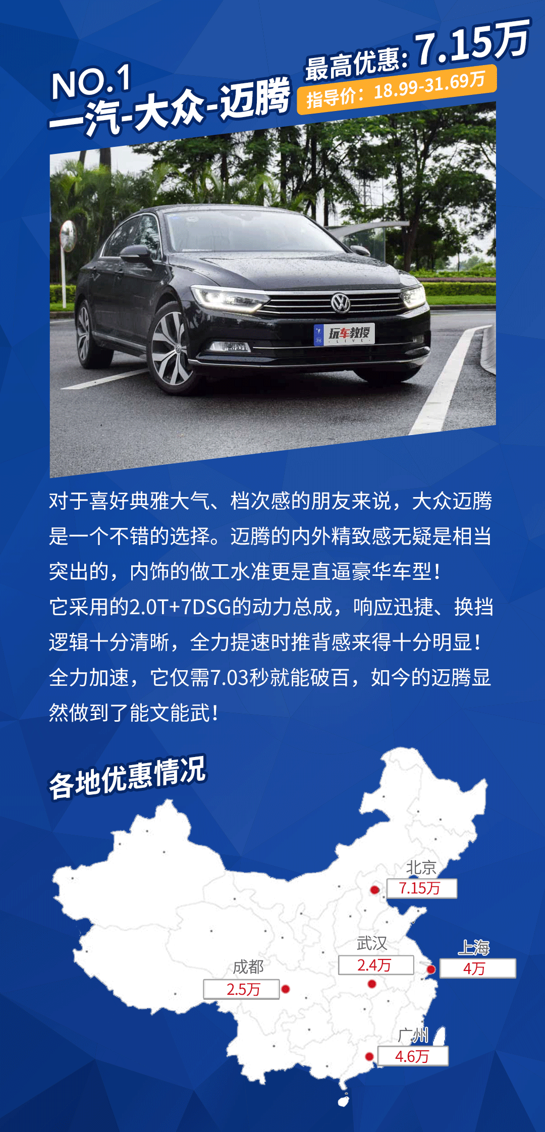 迈腾优惠详情:在广州、北京地区需要加装饰、店内上保险、店内贷款、延长保修、店内上牌、店内置换等项目,附加条件偏多。在武汉、上海地区需要加装饰、店内上保险、店内贷款、店内上牌。成都地区为现金直接优惠,