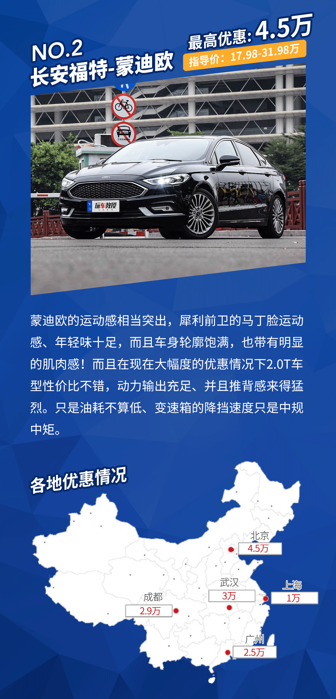 车型点评:可以看出在广州、成都、上海等地,蒙迪欧的优惠幅度还是比较给力的,在这些地区的朋友如果需要一辆动力足、行驶质感优良的车型的话,不妨多去留意它!